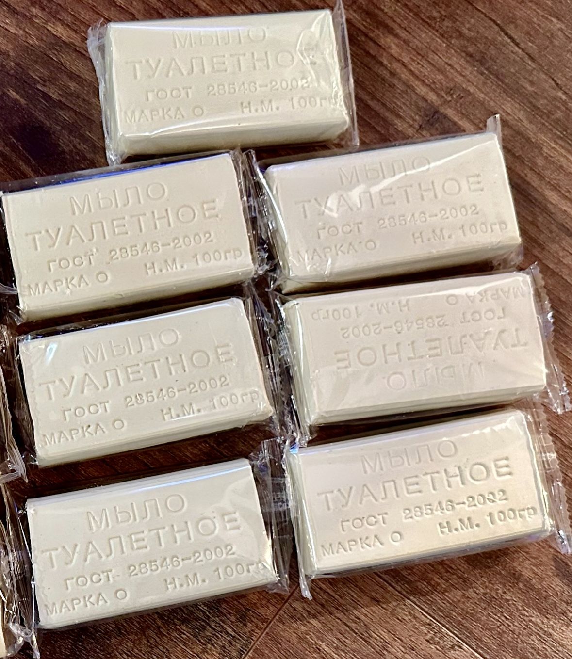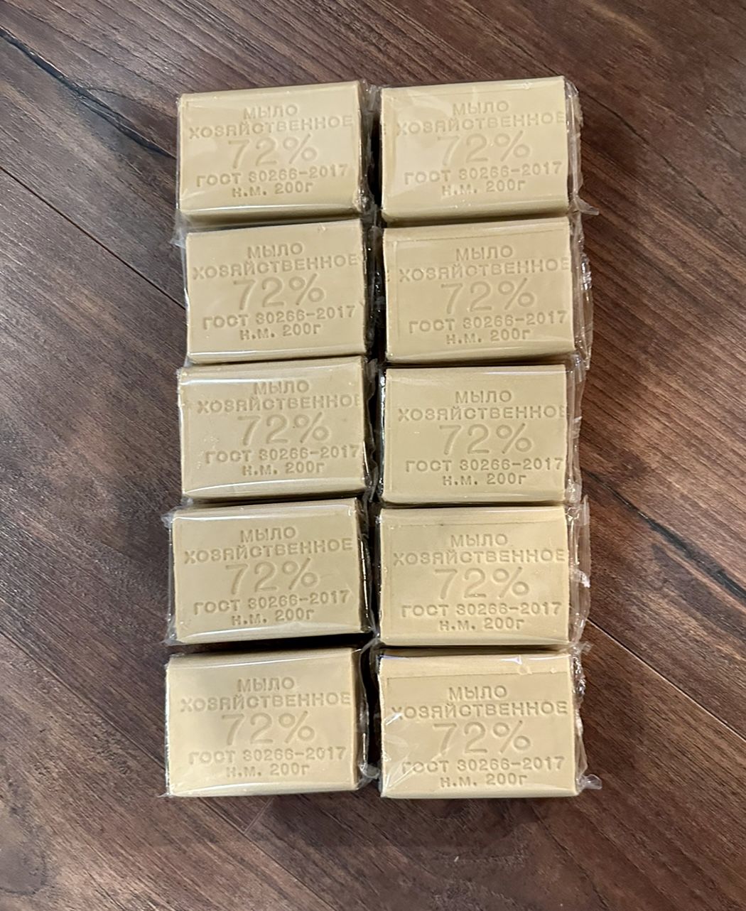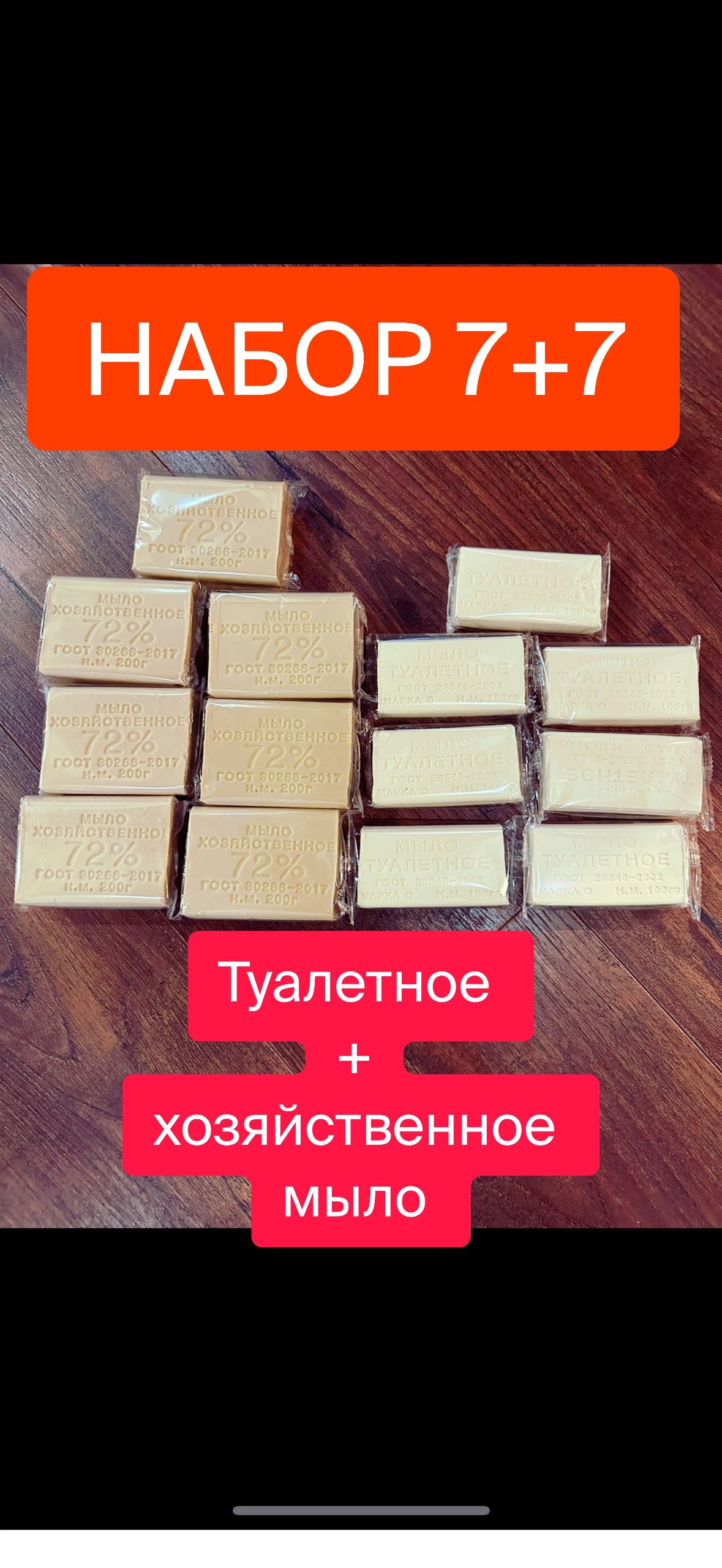 набор 7 кусков по 200 грамм хозяйственное мыло + 7 кусков по 100 грамм туалетное мыло в индивидуальной целлофановой упаковке в картонной коробке