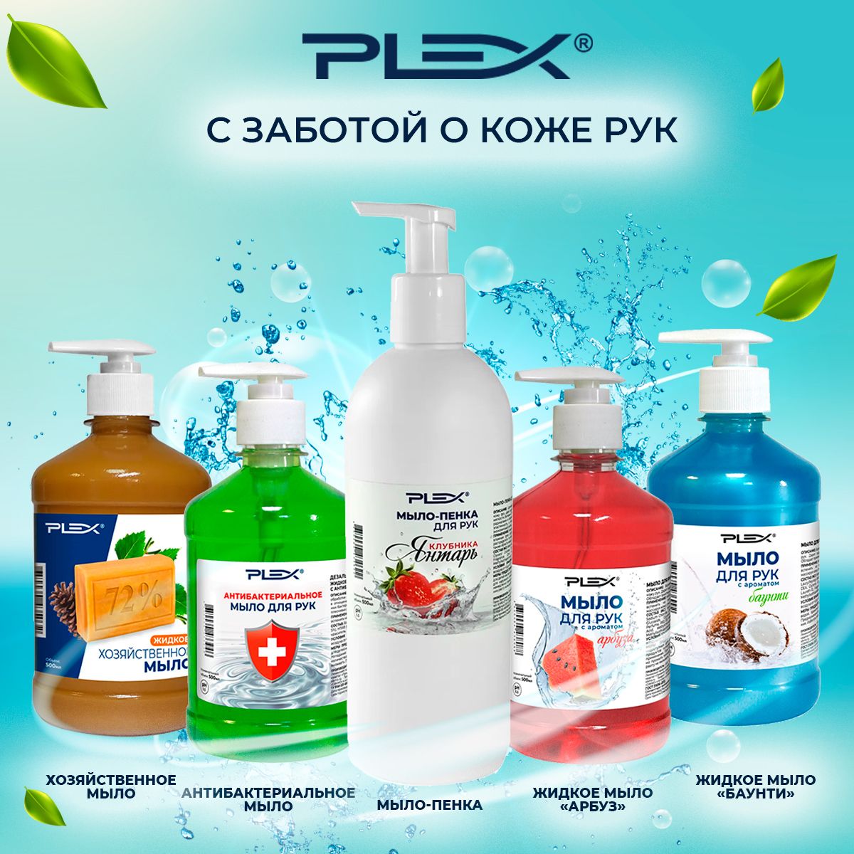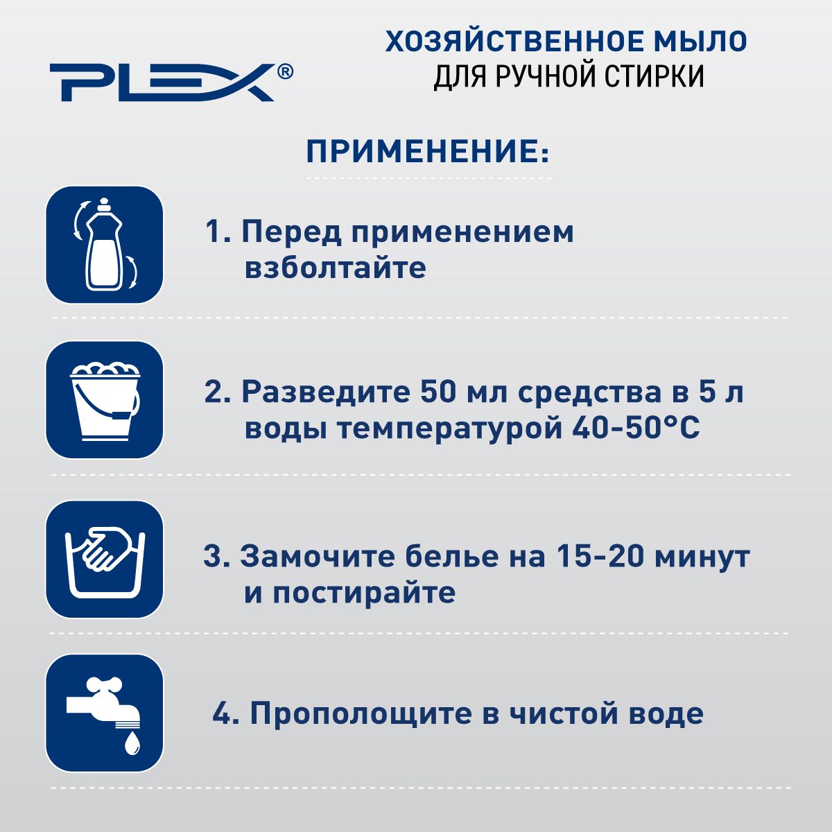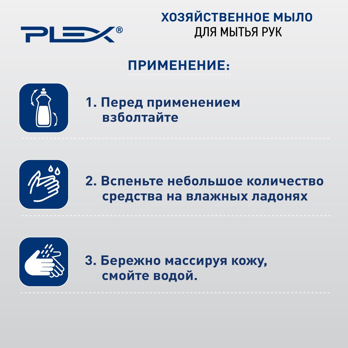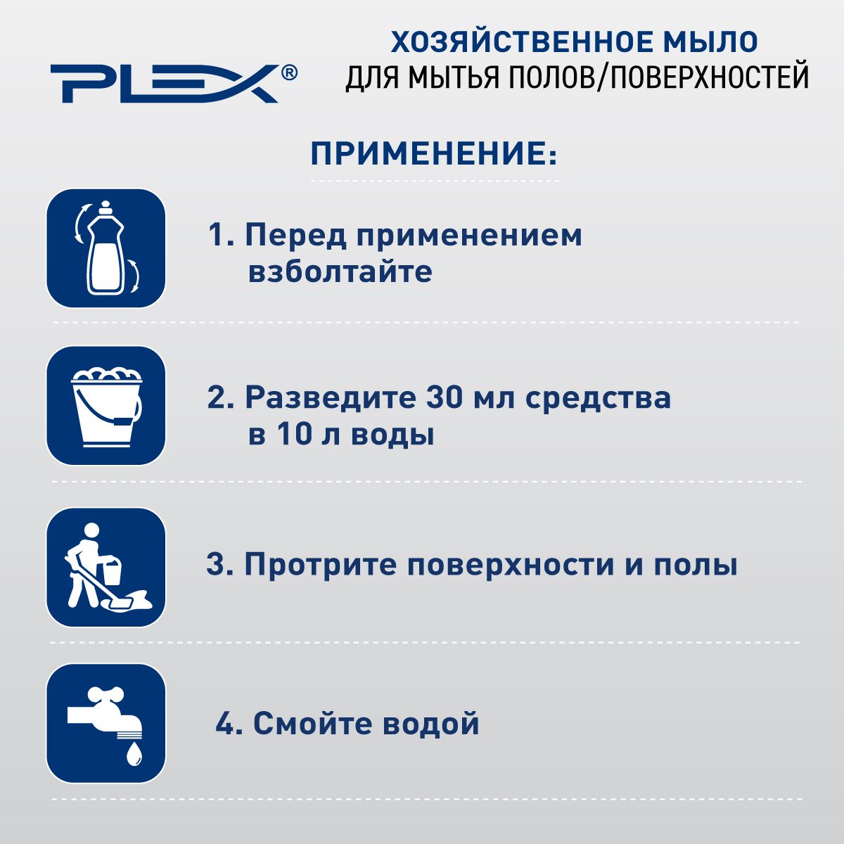 густую мыльную пену. ОБИЛИЕ ПЕНЫПрименение эффективного универсального хозяйственного жидкого мыла, позволяет прервать цепь развития многих инфекций. Жидкое мыло для рук PLEX лучше пенится. Это не только визуальный эффект. Пенообразование важный элемент очищающих свойств. Причем хорошо пенится оно и в жесткой, и в мягкой воде.ЭФФЕКТИВНО ВО ВСЕМ ДОМЕЖидкое мыло для эффективной и быстрой уборки. Средство не содержит вредных и опасных для здоровья и окружающей среды веществ. Бережно очищает любые поверхности, в том числе сантехнику, полы. Идеально подходит для мытья посуды и может применяться для ручной стирки.