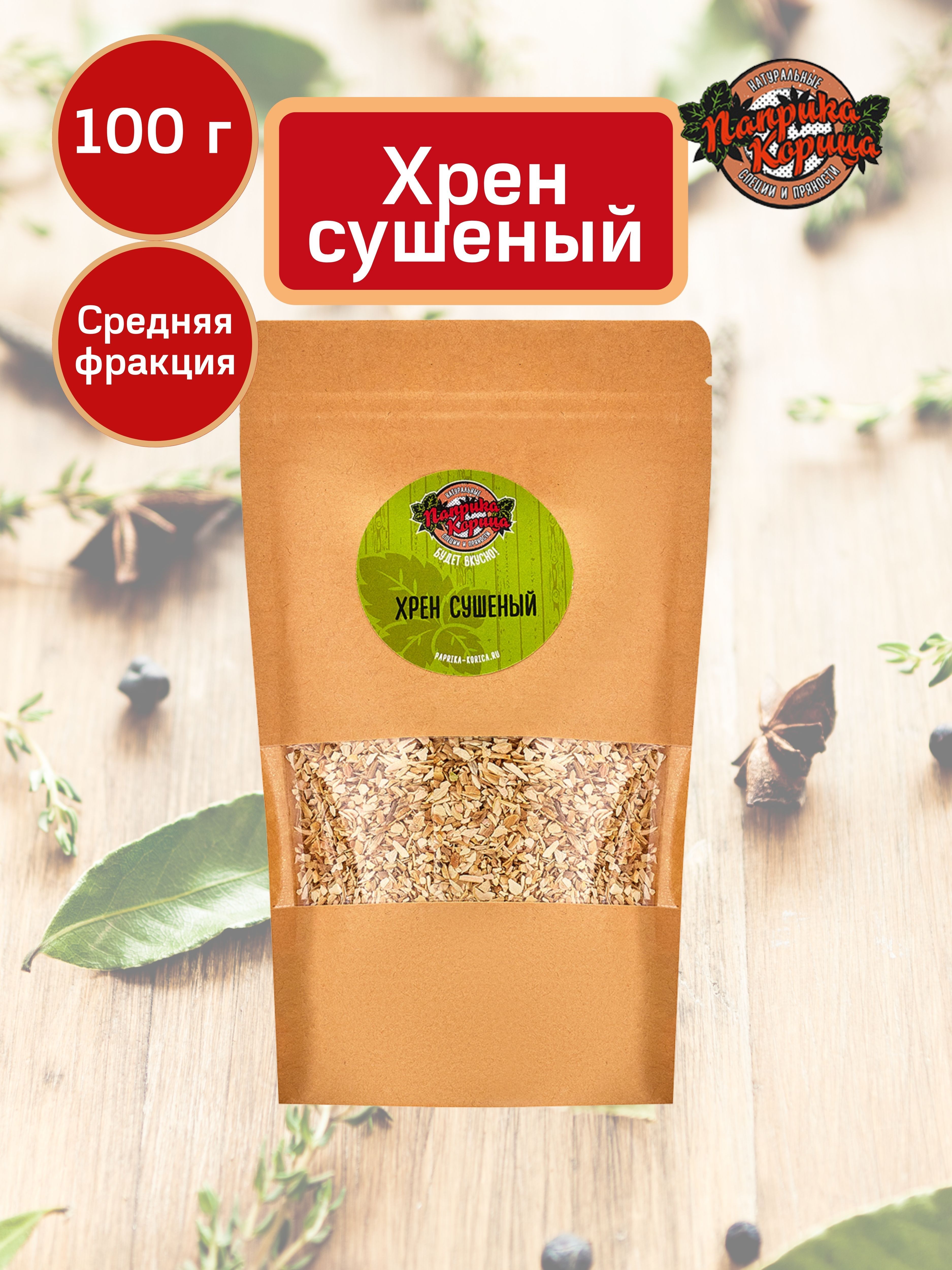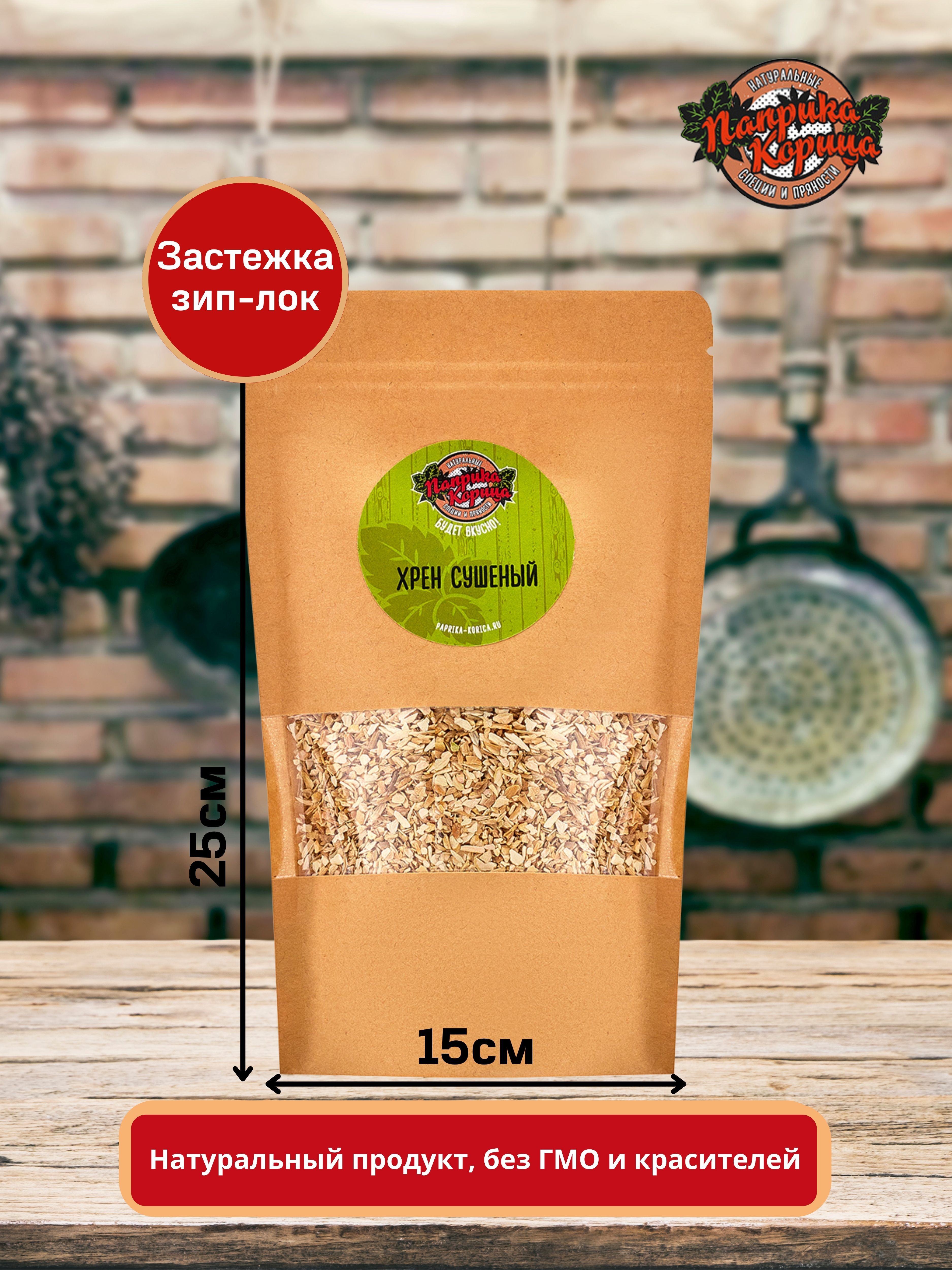 Сушеный корень хрена, фракцией 2-3 мм, упакован в герметичный крафтовый пакет с zip-замком. Так пряность надолго сохранит свежесть и аромат.