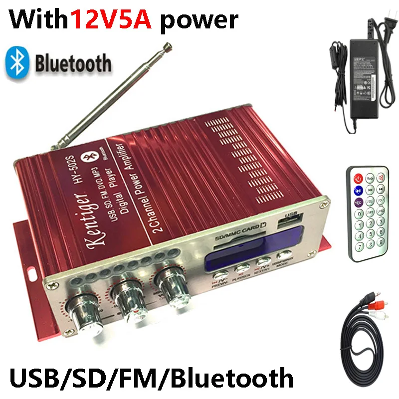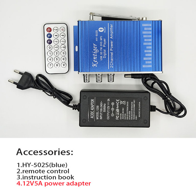 HY-502S KENTIGER с адаптером питания 12 В, 5 А, 40 Вт, мини-усилитель Bluetooth + AV-кабель + пульт дистанционного управления, USB/SD-картой, FM-радио