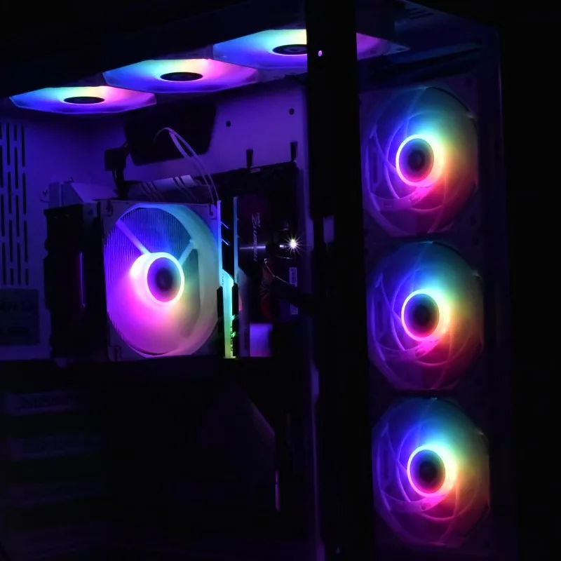 4. 5V 3PIN ARGB Магическая Цветовая синхронизация:Он поддерживает подключение адресуемых интерфейсов ARGB 5 В для ASUS / MSI / Gigabyte / ASRock и других материнских плат для обеспечения программного управления освещением, а 16,8 миллиона цветов могут быть определены программно.