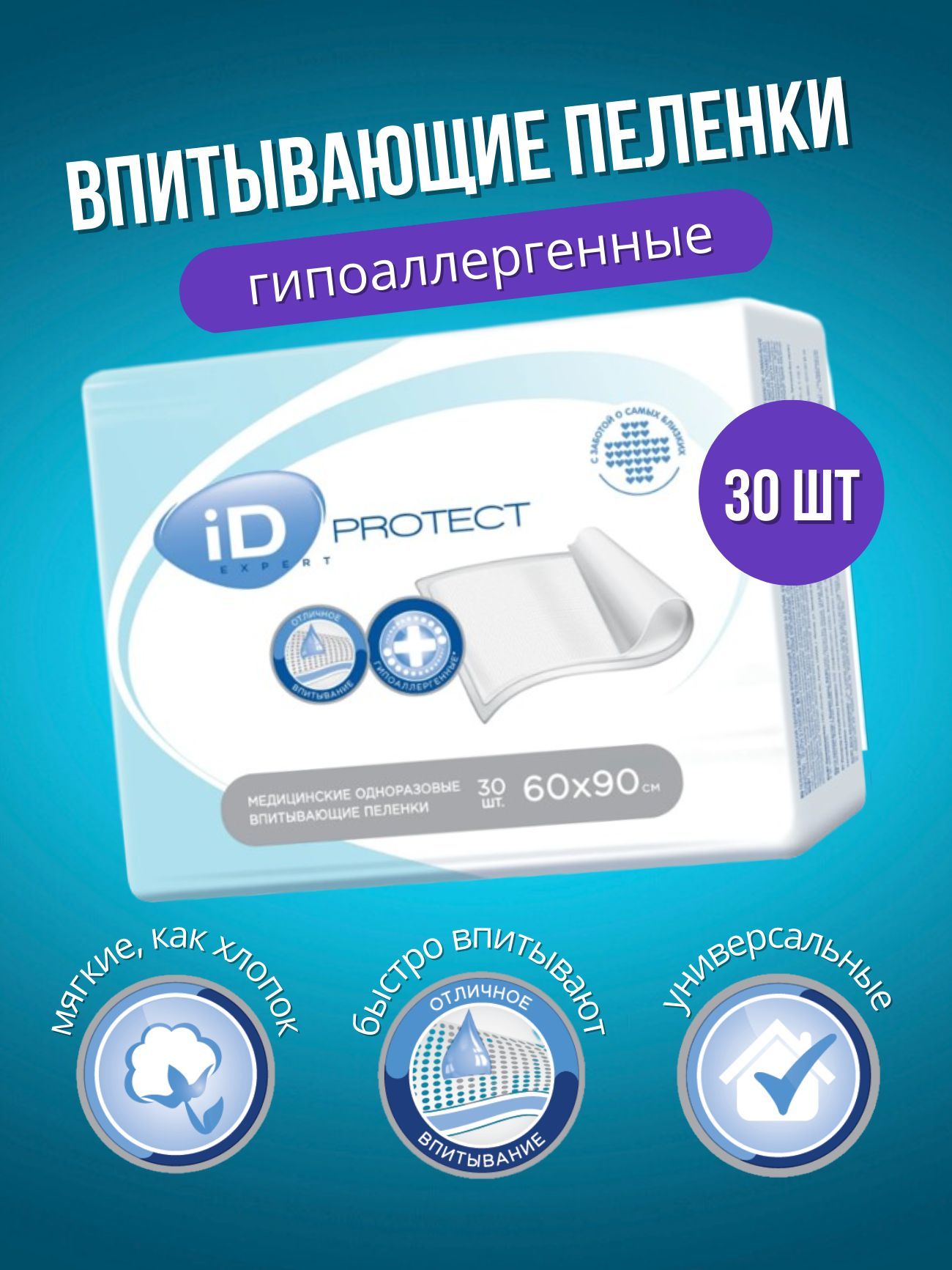 iD Protect Expert / АйДи Протект Эксперт - одноразовые впитывающие пеленки, 90x60 см, 30 шт.