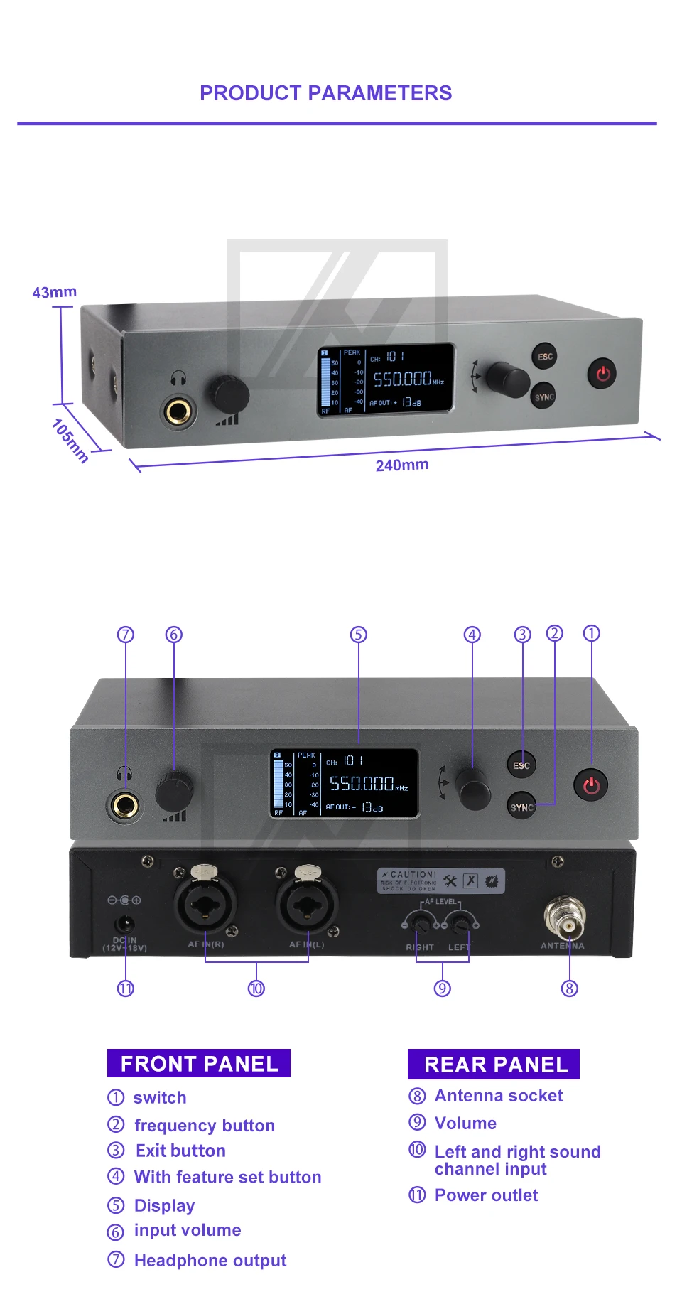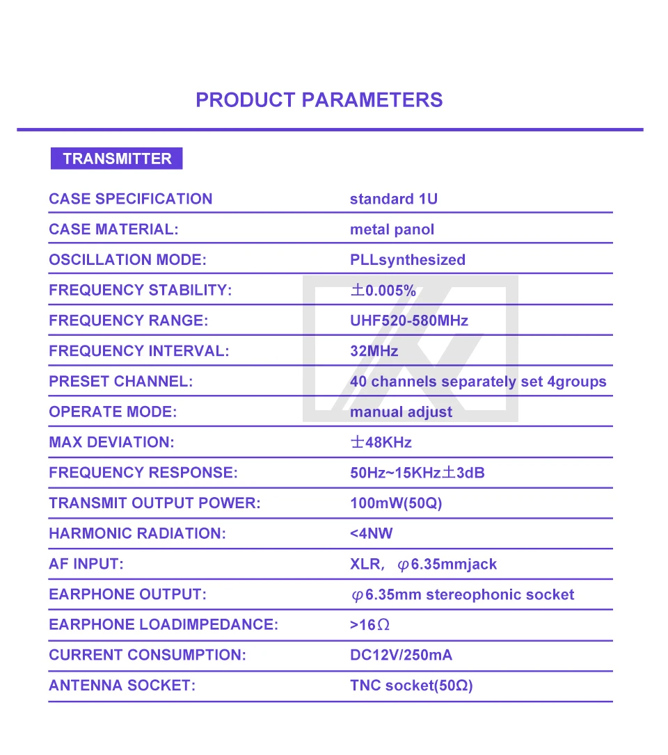 Передатчик: монитор-вкладыш Размер корпуса передатчика: 19 дюймов Размер корпуса оборудования: 4 комплекта передатчиков: цельнометаллический дизайн, режим вибрации: PLL, синтетическая Стабильность частоты: +/-0,005% Диапазон частот: UHF550-580 изменение частоты МГц: 32 МГц Рабочий режим: Ручная регулировка без изменений: отклонение чувствительности одиночной регулировки: 25 кГц 7 дБув, с/п, Максимальное отклонение 78 дБ: +/-48 кГц Частотная Характеристика: 50 Гц, 15 кГц +/-3 дБ Реальный выход: 100 мваф вход: XLR, 6,3 мм, F; Выход на наушники: 6,3 мм, F; Вход электрического потока с одним разъемом: 12 В постоянного тока/250 мА антенна с разъемом: разъем BNC