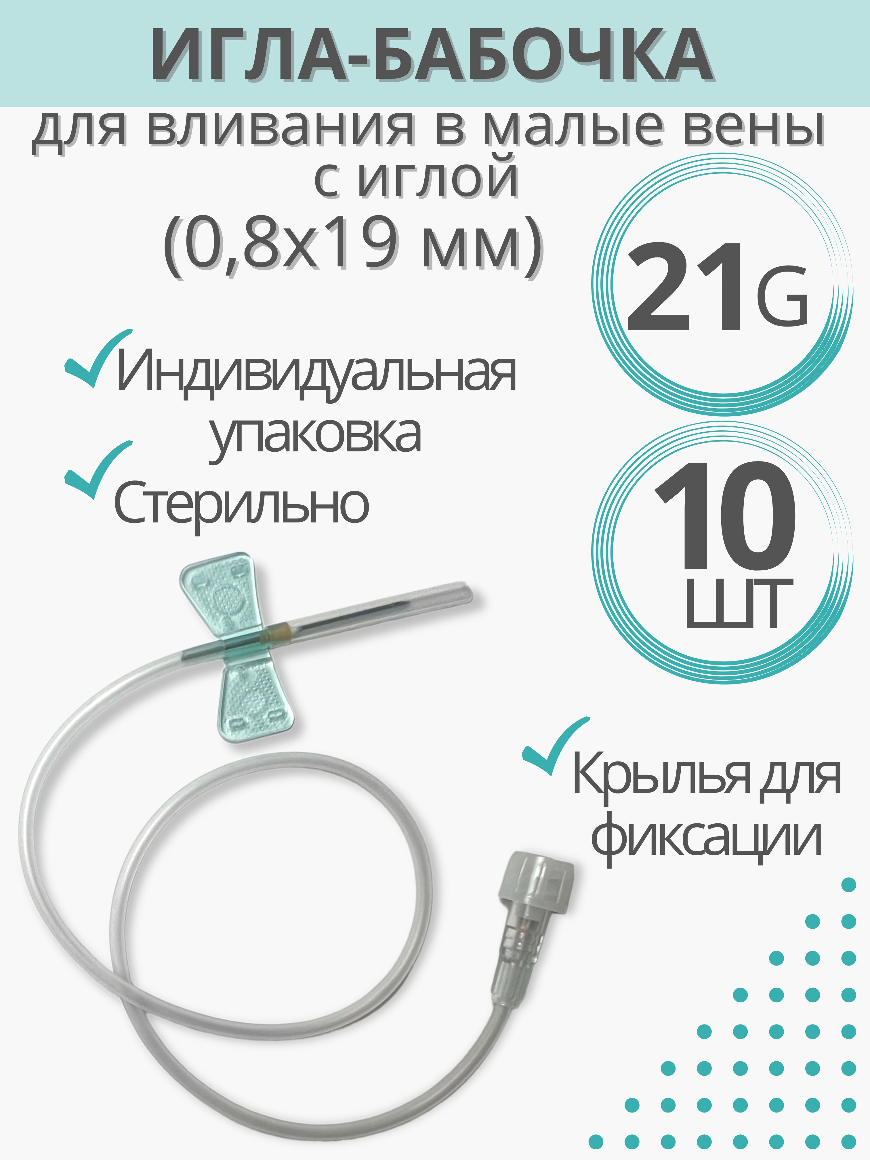 Игла-бабочка 21G (0,8 х 19 mm)/Набор перфузионный одноразовый для вливания в малые вены, комплект - 10 штук