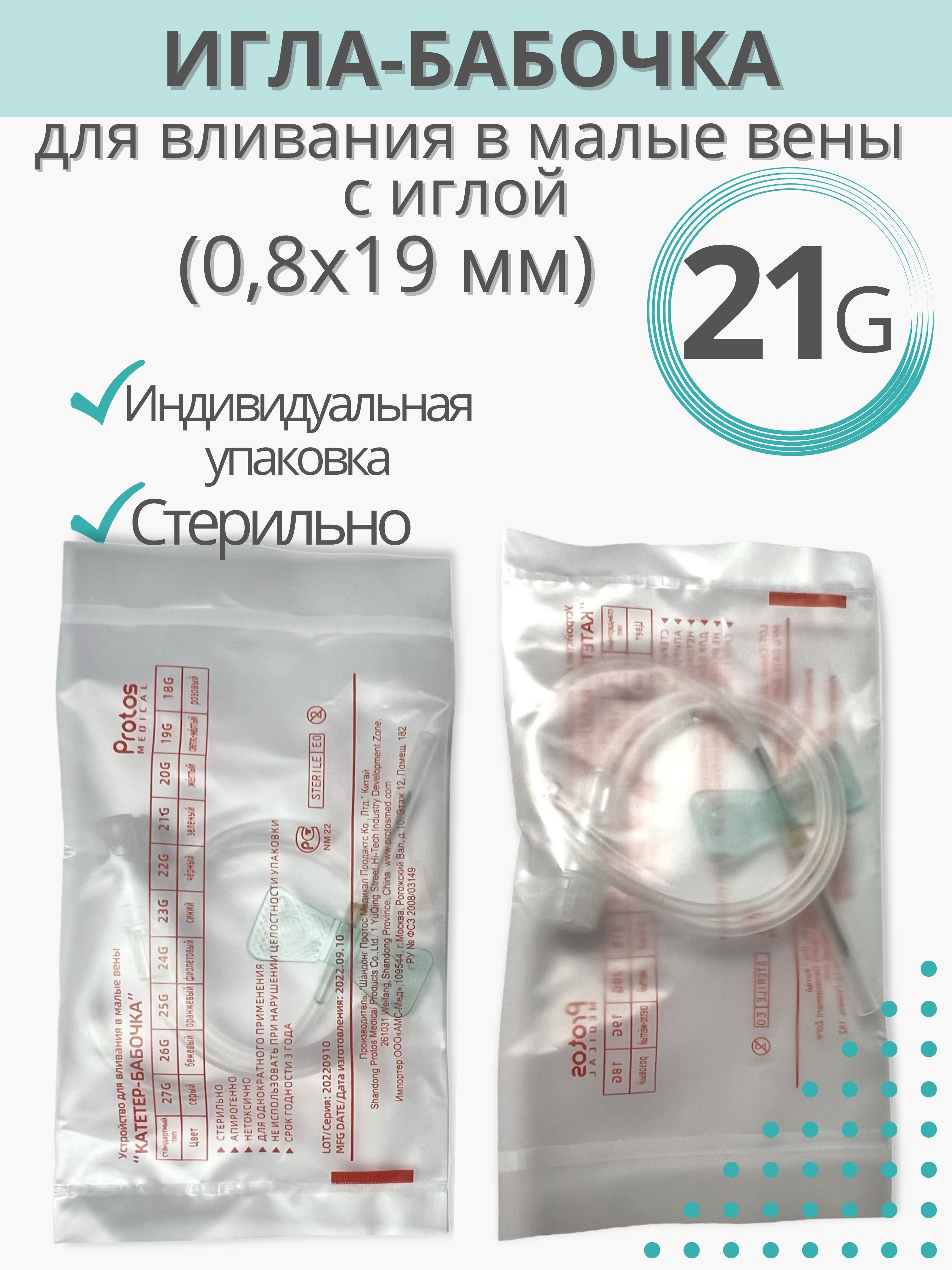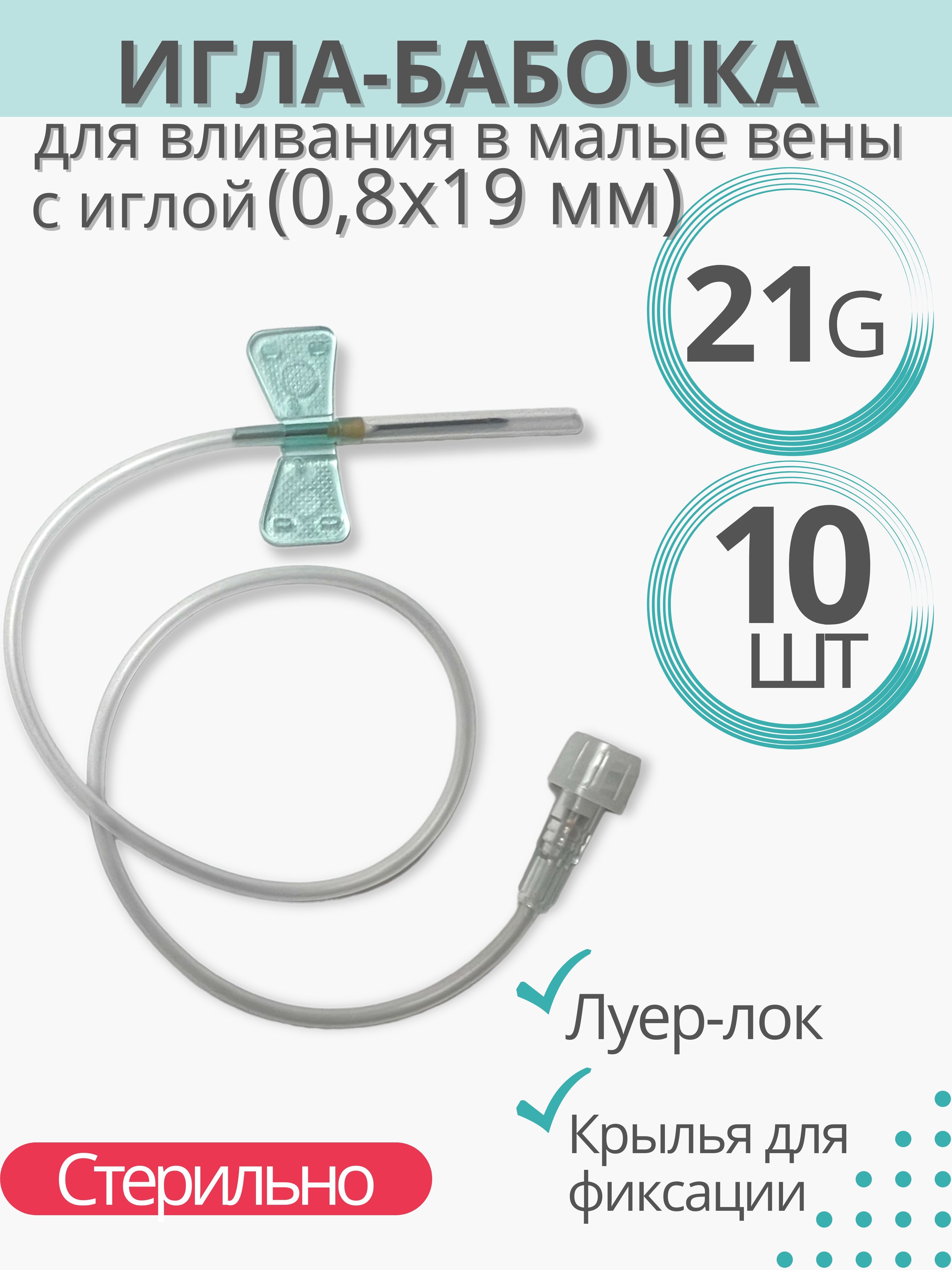 Игла-бабочка 21G Luer Lock (0,8 х 19 mm)/Набор перфузионный одноразовый для взятия проб крови/Германия, комплект - 10 штук