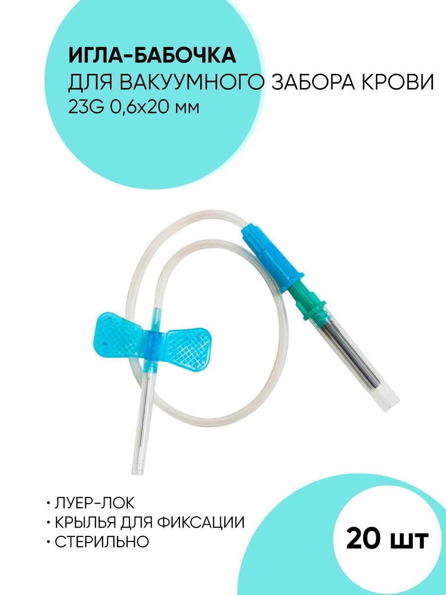 Игла-бабочка для забора крови 23G 0.6x19 - 20 штук. Игла-бабочка