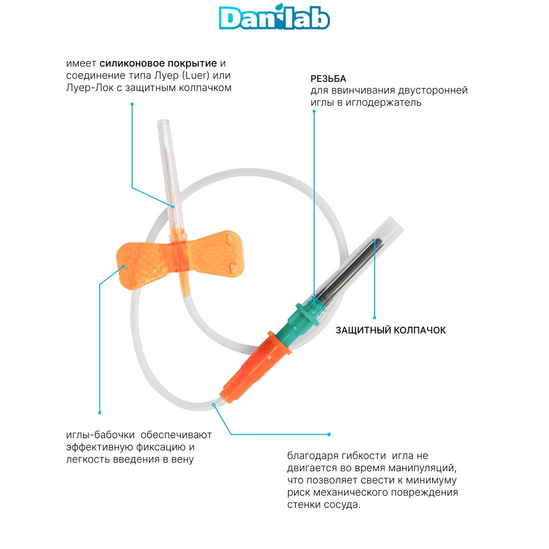 Описание: Текстовое описание изображенияИгла бабочка 25GИгла бабочка предназначена для введения медикаментов в периферические малые вены при внутривенных инфузиях, или забора крови на анализ. Представляет собой гибкую, тонкую прозрачную трубку из поливинилхлорида медицинской марки длиной 190 мм, которая позволяет проводить манипуляции вдали от места венепункции, снижая риск смещения иглы и случайного повреждения вены.
