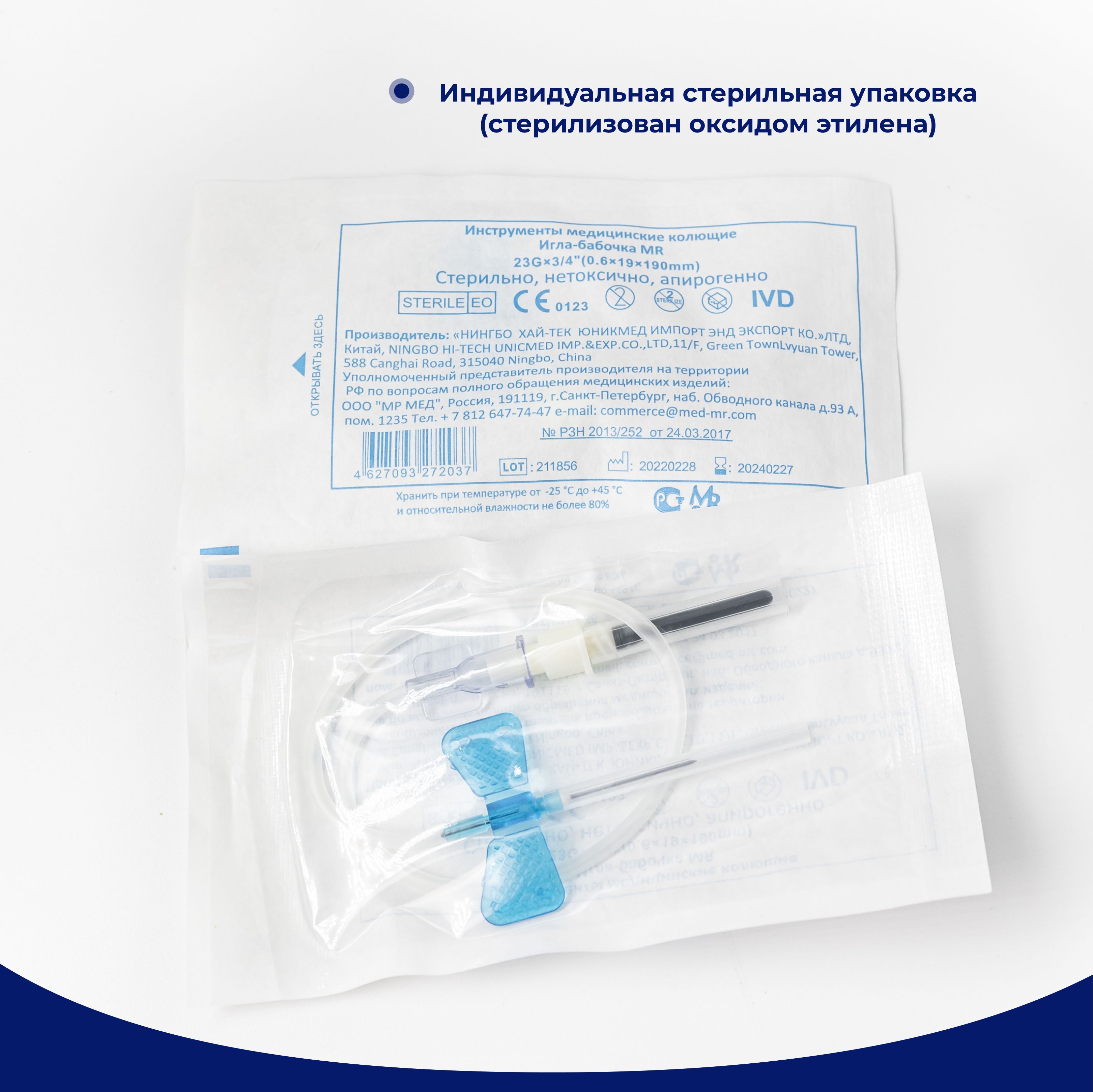 Игла - бабочка G23, 10 штук, для вливания в малые вены, игла ( 0,6 х 19мм.) взятия проб крови