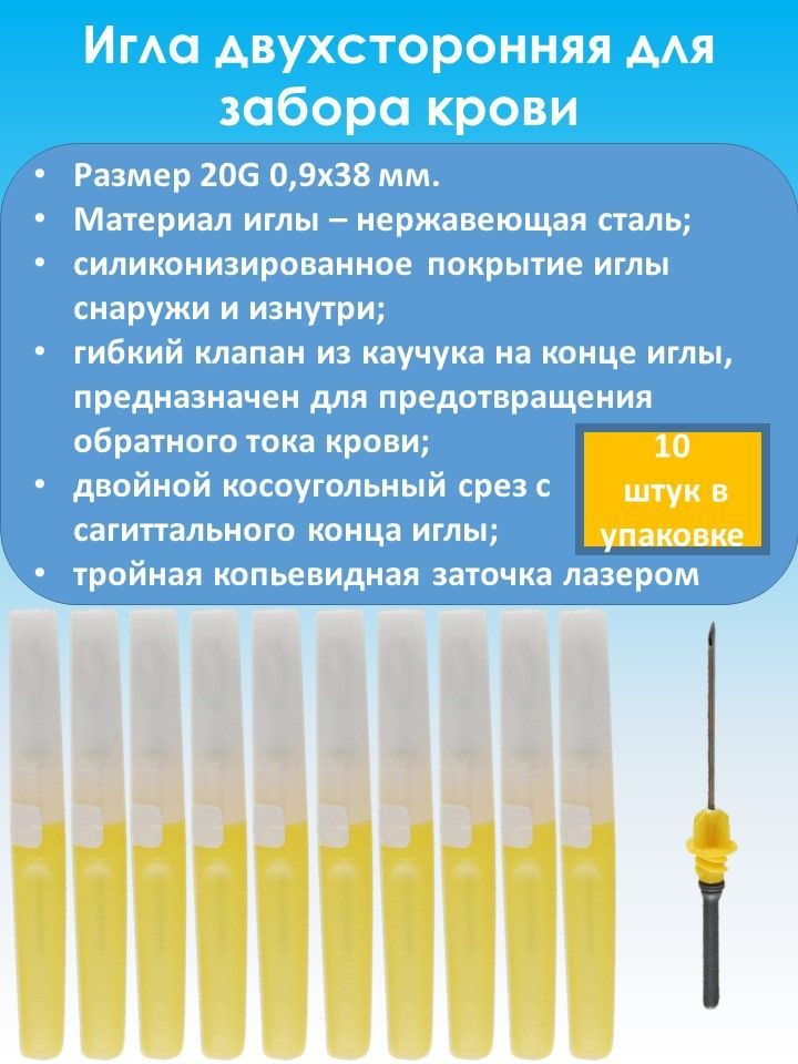 Игла двусторонняя для забора крови 20G 0.9x38 мм, жёлтая (10 штук в упаковке)