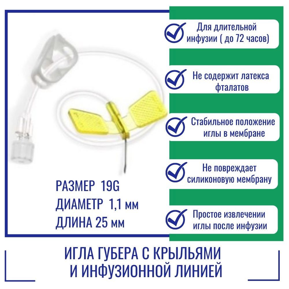 Игла Губера при введении раздвигает стенку мембраны, а после выведения иглы мембрана быстро возвращается к исходному состоянию. Игла с крыльями надежно закрепляется и используется при необходимости постоянного или долгосрочного получения лекарств. Инфузионная линия предназначена для введения препарата. Игла является стерильной.