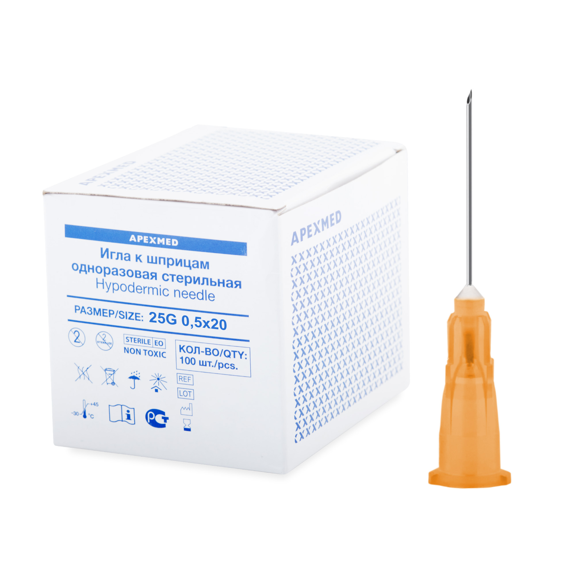 Игла инъекционная Apexmed Луер, 25G, 0,5х20 мм, 100 шт, стерильная, для внутривенных и внутримышечных инъекций и уколов