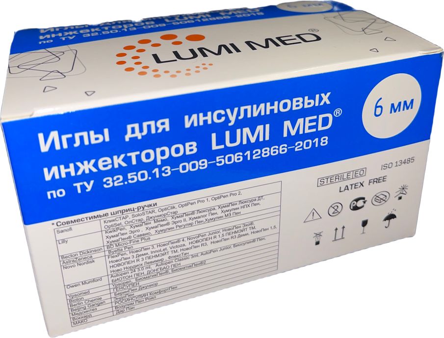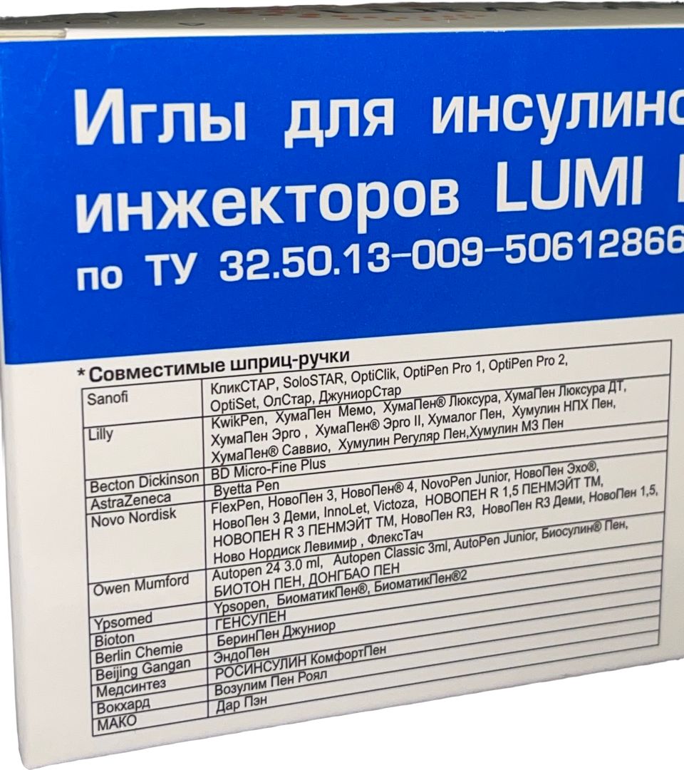 Оптимальный размер иглы LUMI MED подбирается в соответствии с рекомендациями лечащего врача. Винтовая резьба на внутренней части канюли инъекционной иглы универсальна и совместима со шприц-ручками для введения инсулина всех ведущих производителей. Регистрационное удостоверение РУ Росздравнадзора № РЗН 2020/10206 от 09 июня 2021 года