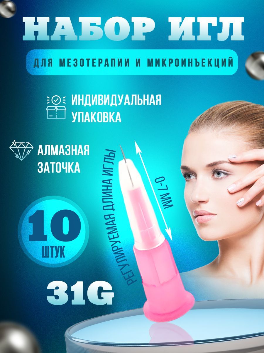Иглы для мезотерапии и микроинъекций 31G (0.26) х 7 мм ( с возможностью регулировки длины иглы от 0 до 7 мм ), 10 шт. (Игла для шприца)
