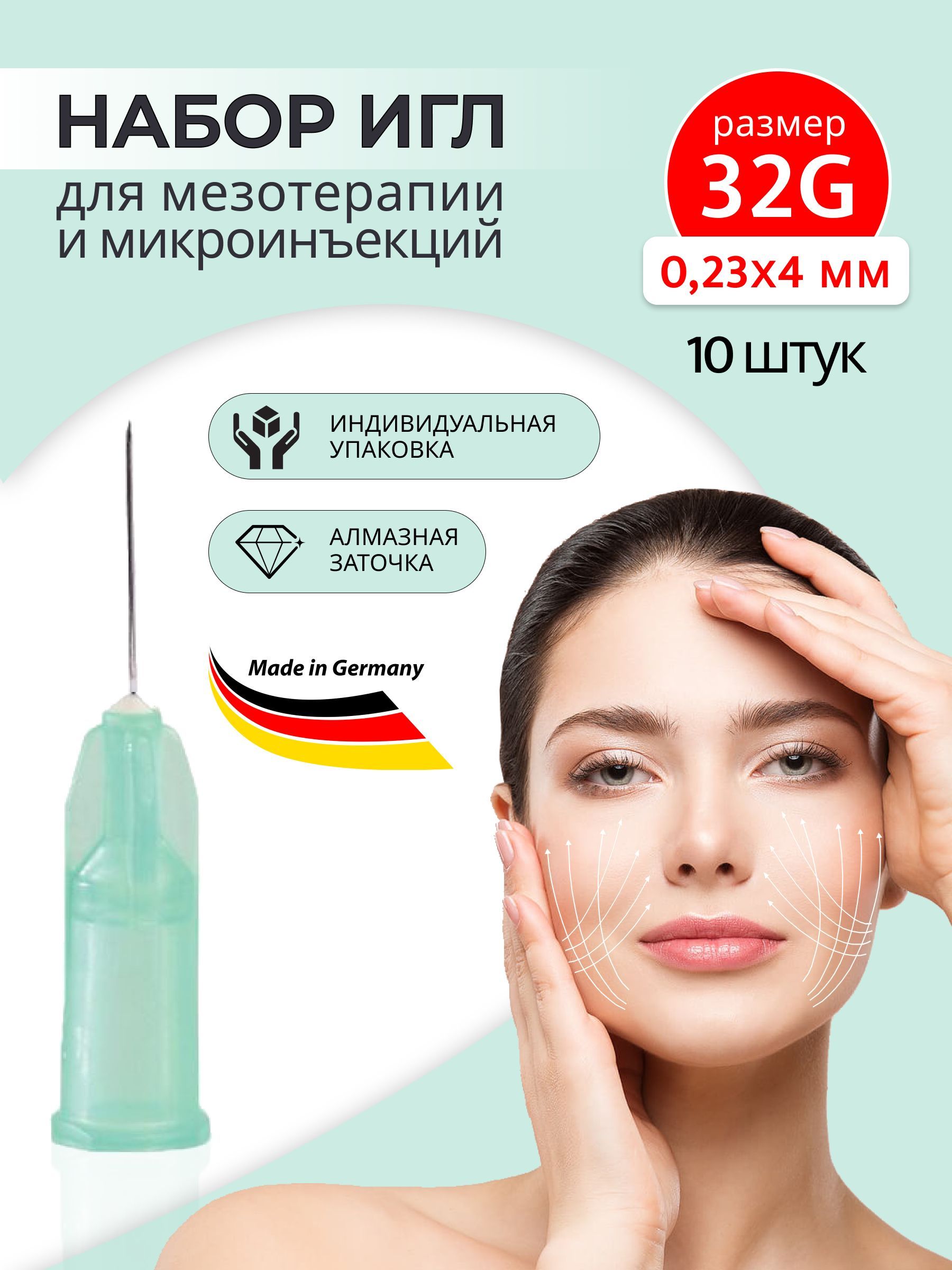 Иглы для мезотерапии и микроинъекций 32G (0.23 мм х 4 мм), 10 шт, иглы медицинские стерильные одноразовые, Германия