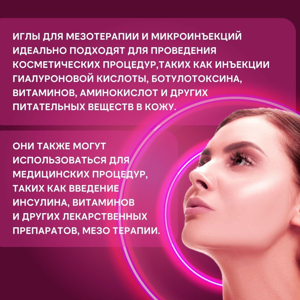Эти иглы для мезотерапии и микроинъекций идеально подходят для проведения косметических процедур, таких как инъекции гиалуроновой кислоты, ботулотоксина, витаминов, аминокислот и других питательных веществ в кожу.