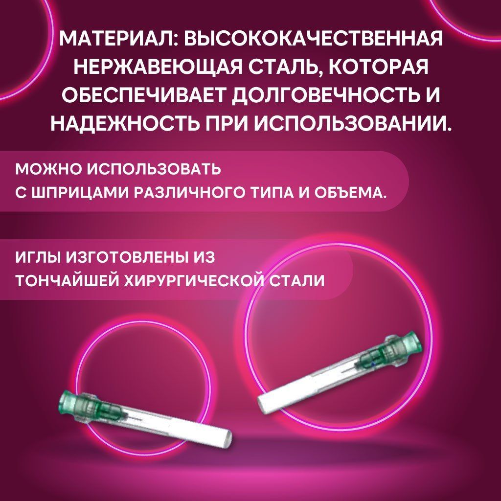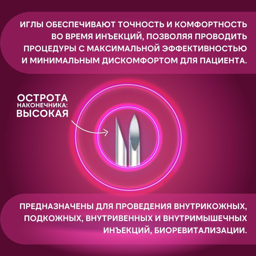 Эти иглы обеспечивают точность и комфортность во время инъекций, позволяя проводить процедуры с максимальной эффективностью и минимальным дискомфортом для пациента. Они также долговечны и надежны в использовании благодаря высококачественному материалу, из которого они изготовлены.