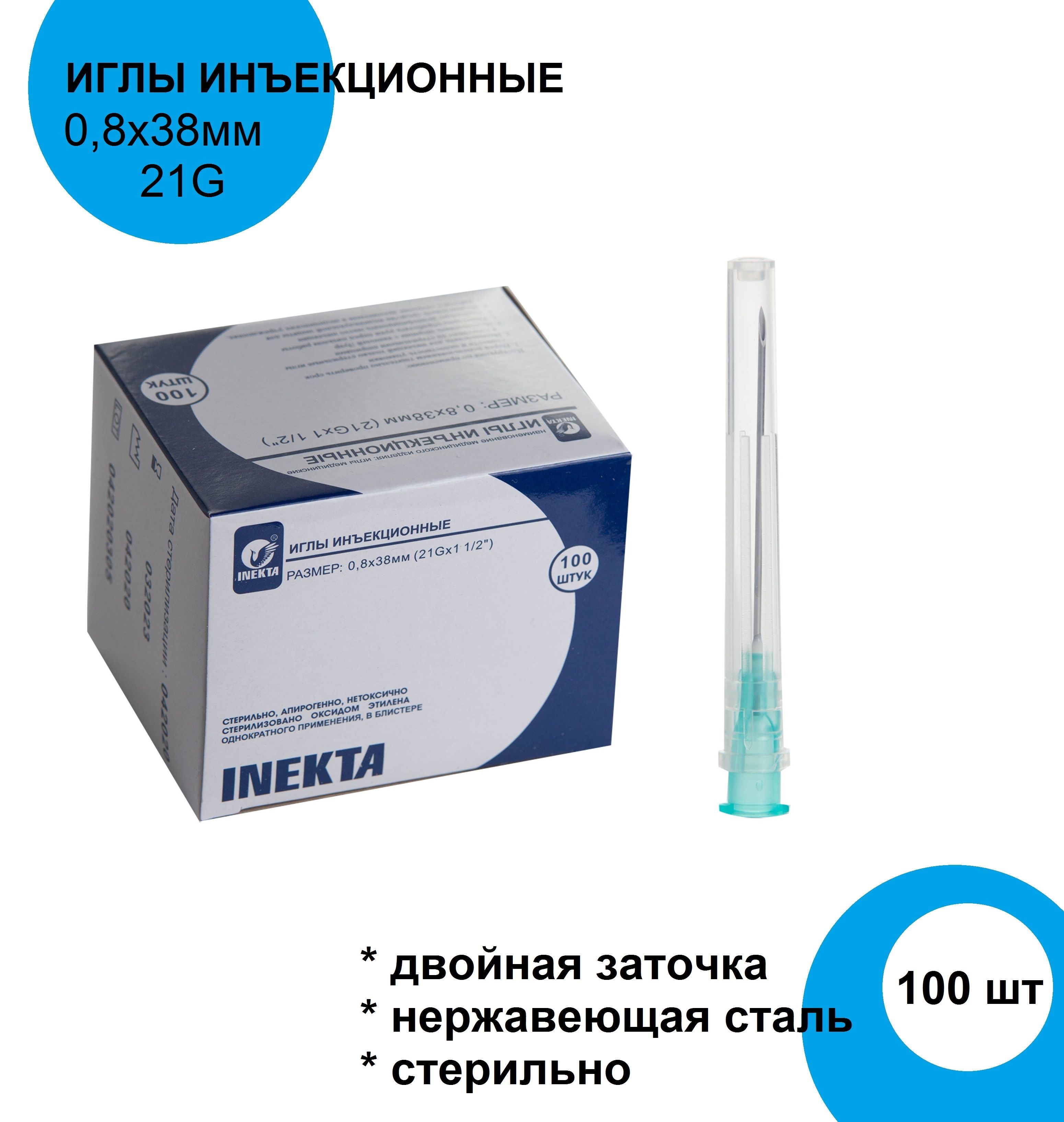 Иглы для шприцов медицинские стерильные инъекционные / одноразовые иголки для инъекций и уколов из хирургической нержавеющей стали 0,8*38 мм 21G Inekta, набор 100 шт