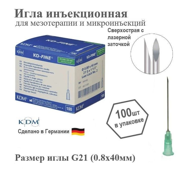 Иглы инъекционные KDM, G21 0,8 x 40 мм, 100 шт., производство Германия.