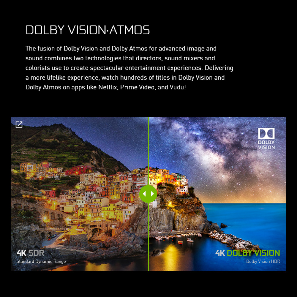 Уровень до SHIELD TV Pro для большего места для хранения, двух портов USB 3,0 для расширения и медиасервера PLEX. Наслаждайтесь кинематографическим опытом с визуальными эффектами, подаренными вам Dolby Vision HDR, и захватывающим звуком с объемным звуком Dolby Atmos. Упаковано с функциями, чтобы даже самые требовательные пользователи гордились.