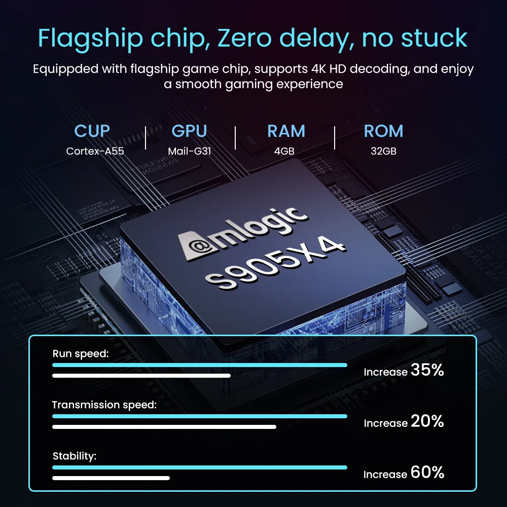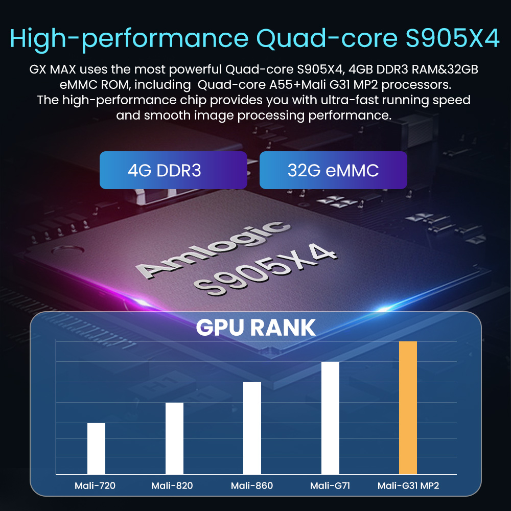 Самый мощный четырехъядерный процессор S905X4 ,4 ГБ ОЗУ DDR3 и 32 ГБ ПЗУ eMMC, включая Четырехъядерные процессоры A55 + Mail G31 MP2.