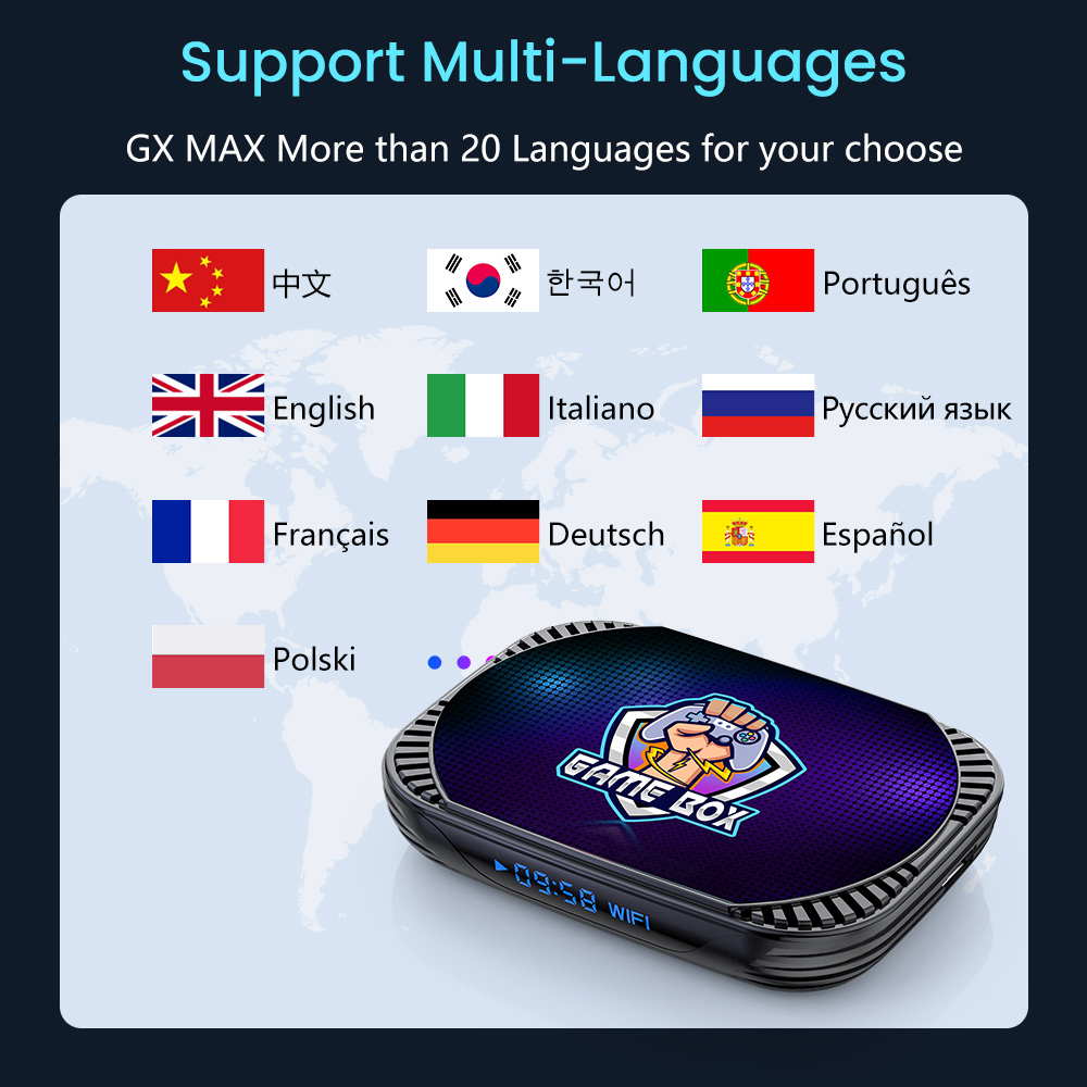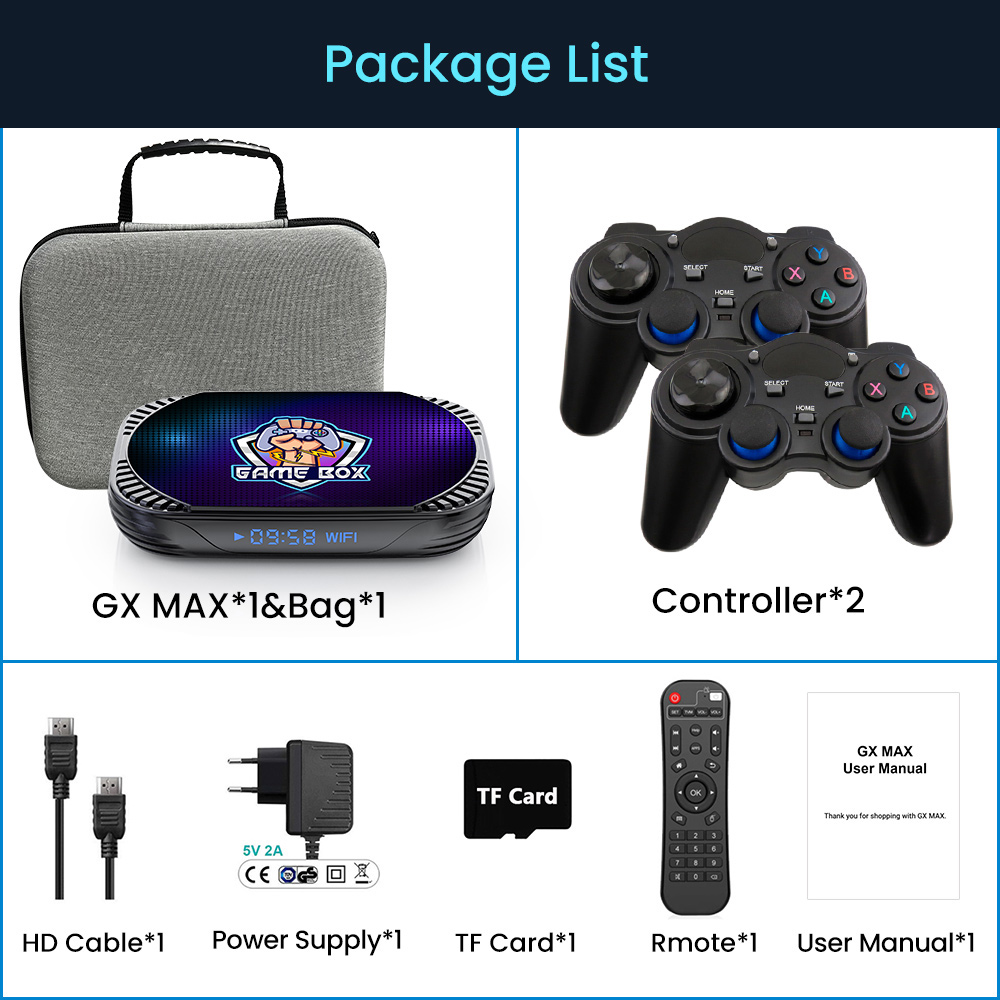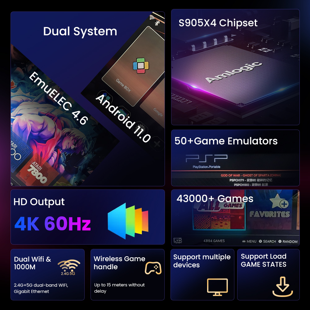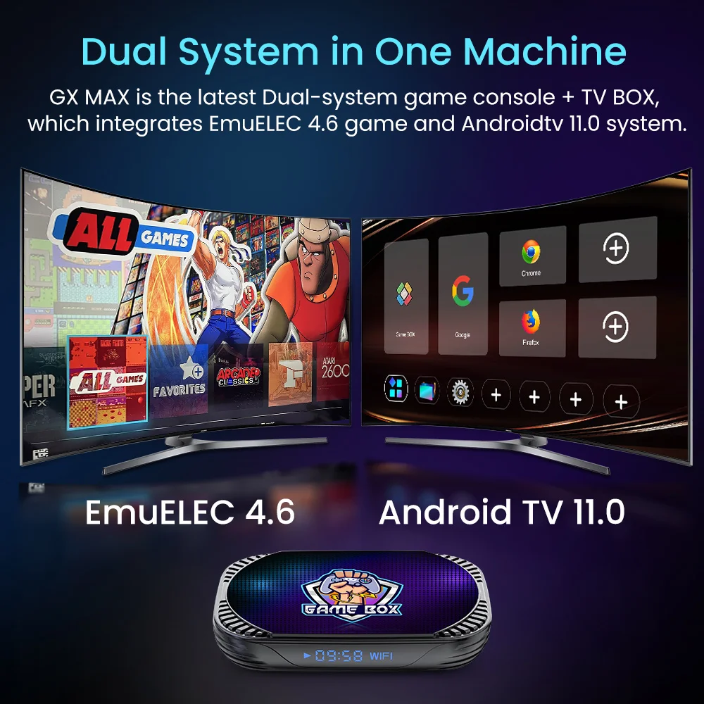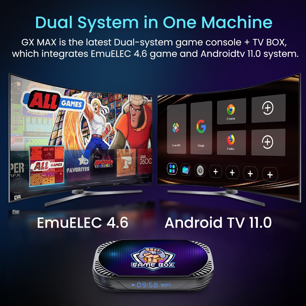 GX MAX-это новейшая двухсистемная игровая консоль + TV BOX, которая объединяет игру EmuELEC 4,6 и систему Androidtv 11,0.