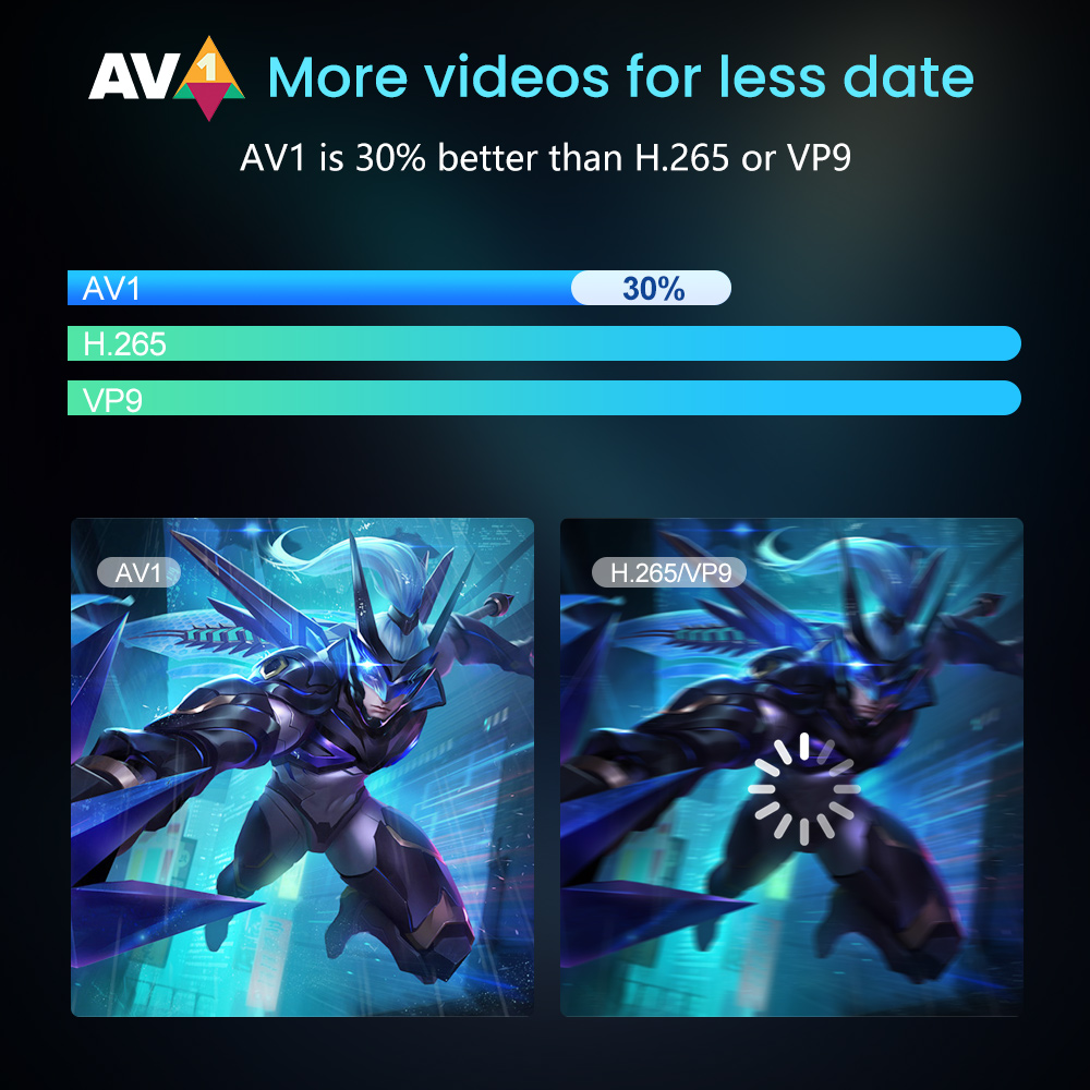 Легко декодировать, его возможности декодирования видео, поддержка вывода высокой четкости 4KAV1 Больше видео для меньшего количества данных