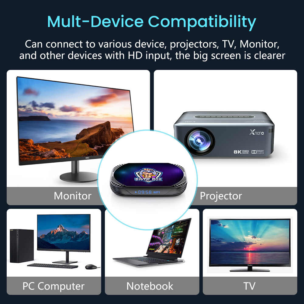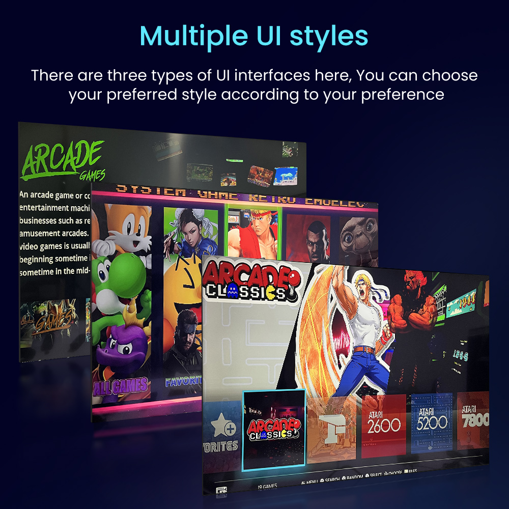 Установлены 43000 + Ретро-игр, готовых к использованию после подключения. Различные экшн-игры, Приключенческие игры, ролевые игры ждут вас, чтобы бросить вызов, пережить время детских игр.Несколько стилей пользовательского интерфейса