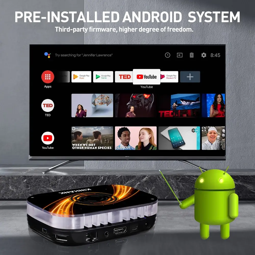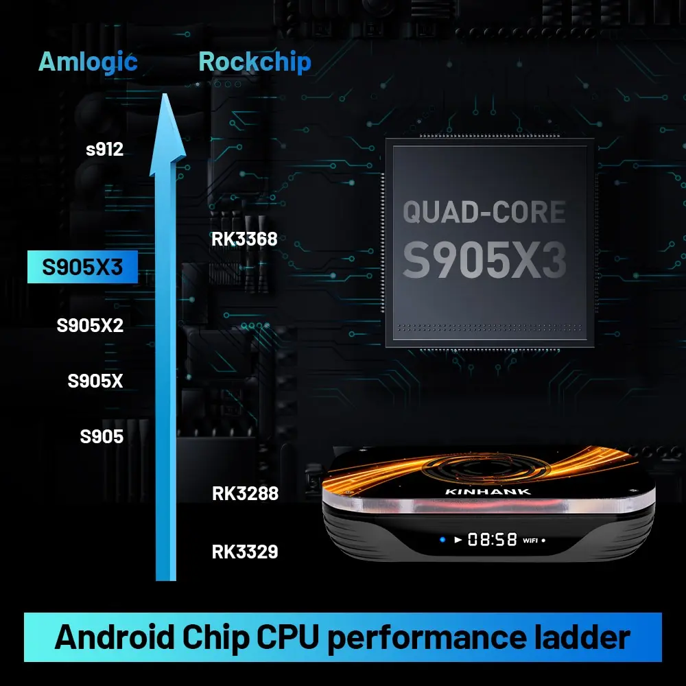 Android TV Box на базе четырехъядерного ядра S905X3 cortex-A55 Ультра-высокочастотный процессор, который обеспечивает стабильную и плавную работу Android-бокса для загрузки фильмов, изображений и игр без буфера.