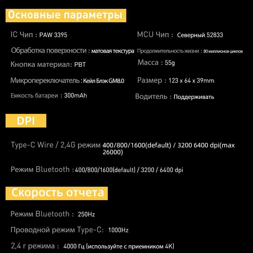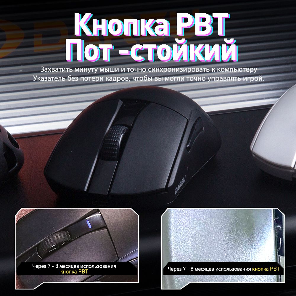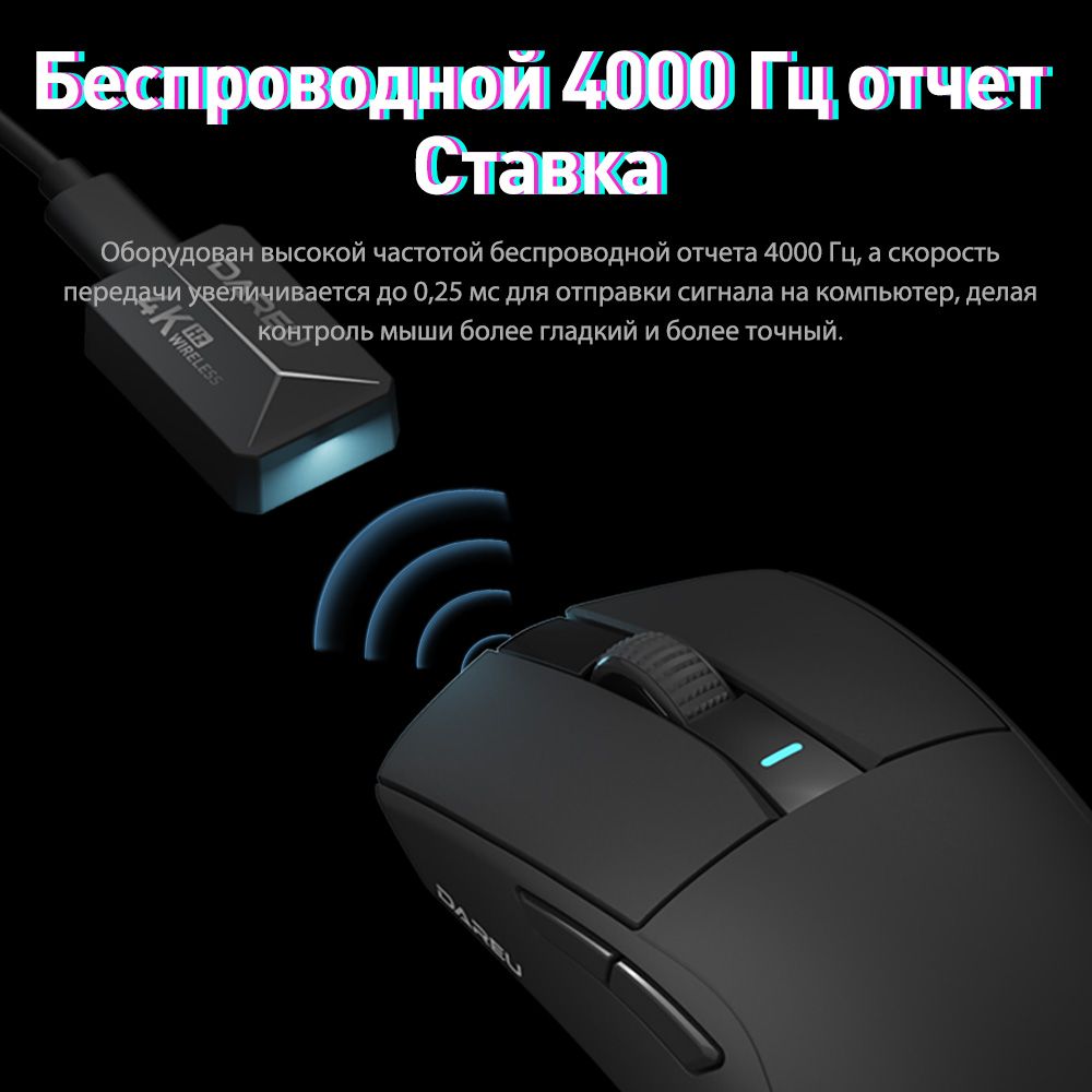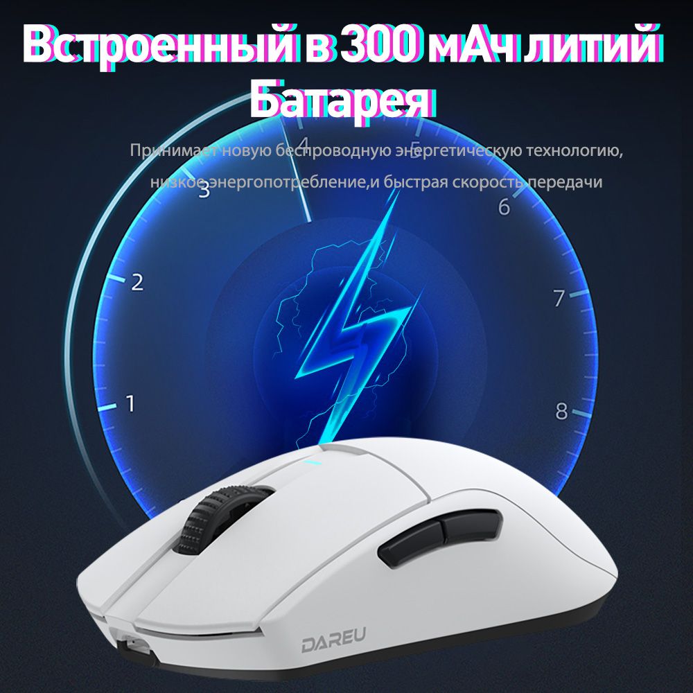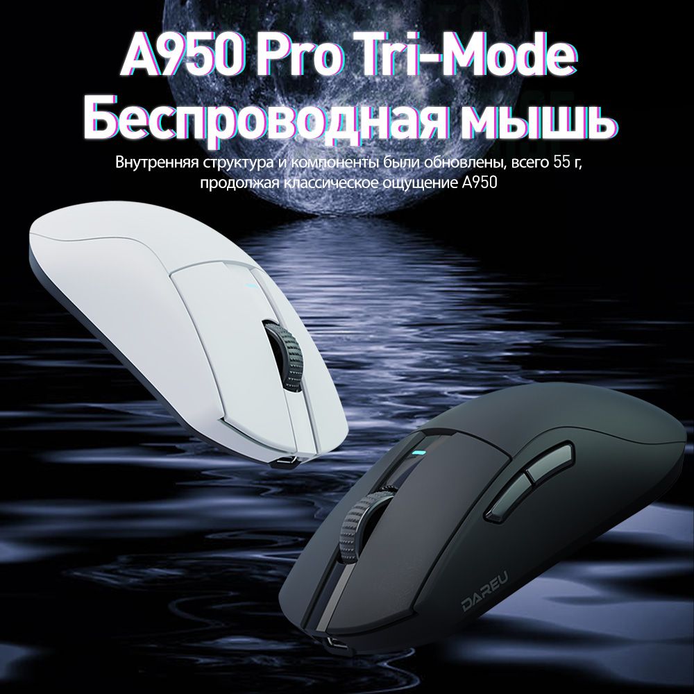 Описание: 55 г легкого дизайнаВысокоэффективная механическая конструкция позволяет A950Pro иметь легкий вес (всего 55 г) на эргономичной форме. Даже после долгих игр правая рука хорошо подходит.Дизайн кнопки PBTПуговицы из материала PBT улучшают ощущение поверхностной текстуры и не производят масла даже при длительном использовании.Подключение в трех режимахТри режима подключения (USB, 2.4G и Bluetooth) поддерживают различные мобильные устройства в системах Win / Mac, и переключение между различными сценариями становится легким.Встроенная литиевая батареяНизкое энергопотребление и быстрая передача позволяют воспроизводить около 25 дней в беспроводном режиме 2,4G (скорость 4K) и около 37 дней в режиме Bluetooth. (Данные из лаборатории DAREU основаны на 4 часах игрового времени в день).Датчик PAW 3395Игровой датчик PAW 3395 обеспечивает точное отслеживание и стабильную производительность, обеспечивая отличный контроль даже при полной скорости.Северная Европа 52833A950PRO совместим с Nordic 52833 MCU и поддерживает удаленный режим работы, чтобы обеспечить более стабильную производительность и управление без задержек, устраняя проблемы с кадрами или застрявшими.Скорость беспроводной передачи данных 4000 ГцСкорость передачи данных до 4000 Гц обеспечивает быструю скорость передачи 0,25 мс для достижения плавной и точной производительности.