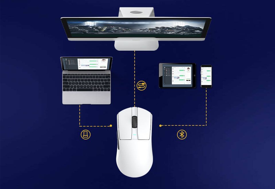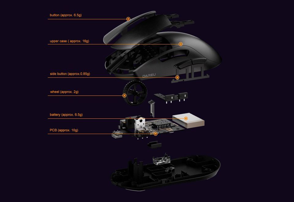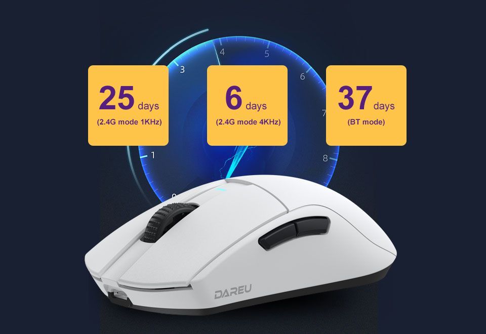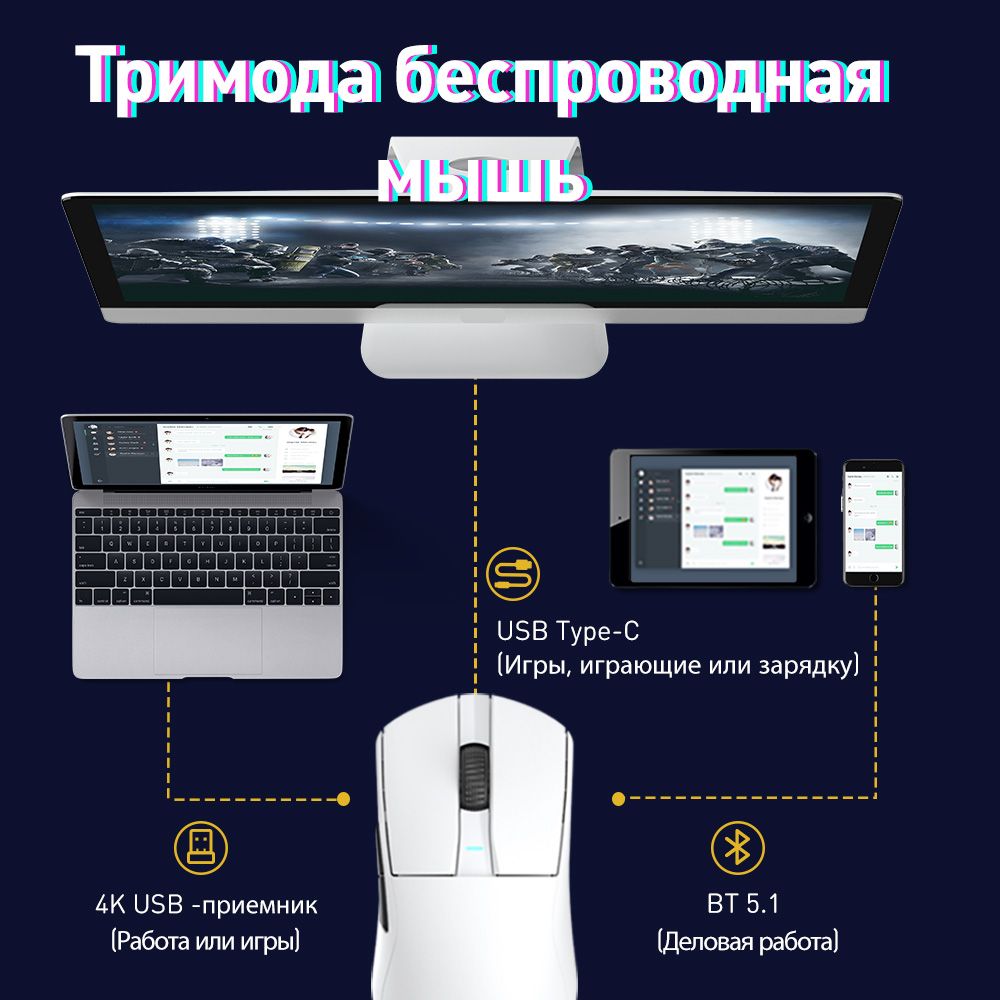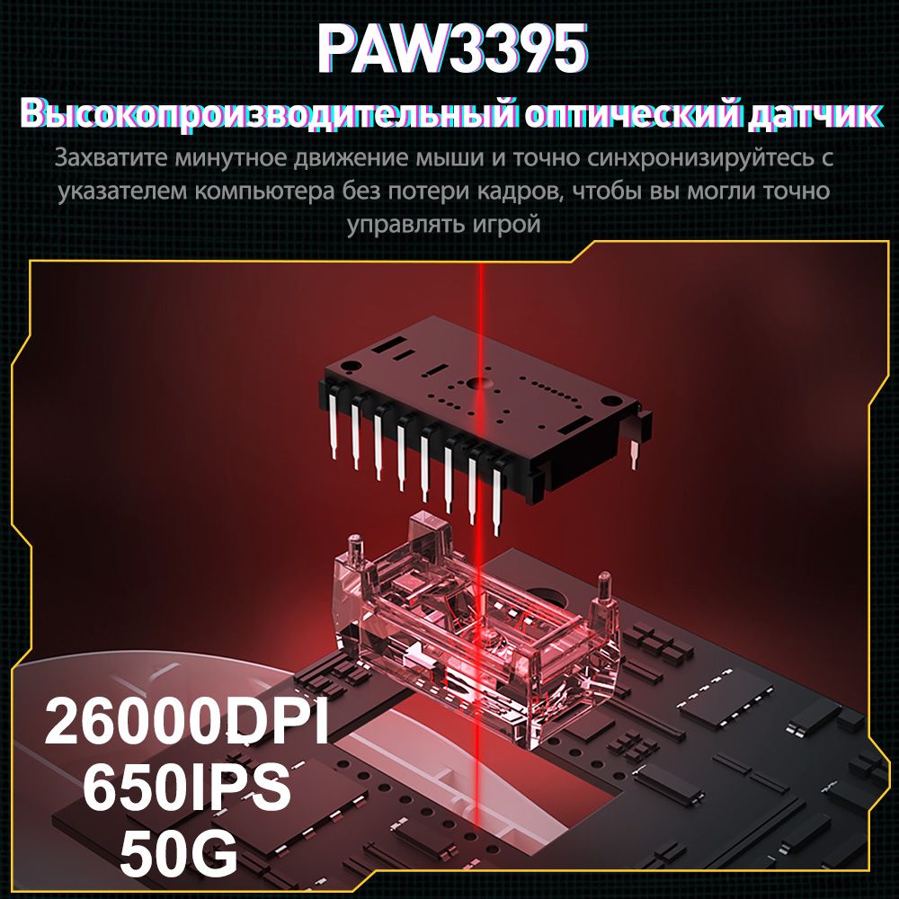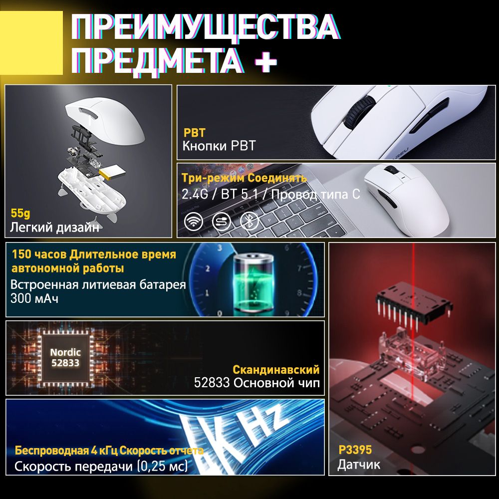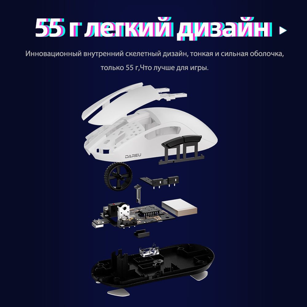 Описание: 55 г легкого дизайнаВысокоэффективная механическая конструкция позволяет A950Pro иметь легкий вес (всего 55 г) на эргономичной форме. Даже после долгих игр правая рука хорошо подходит.Дизайн кнопки PBTПуговицы из материала PBT улучшают ощущение поверхностной текстуры и не производят масла даже при длительном использовании.Подключение в трех режимахТри режима подключения (USB, 2.4G и Bluetooth) поддерживают различные мобильные устройства в системах Win / Mac, и переключение между различными сценариями становится легким.Встроенная литиевая батареяНизкое энергопотребление и быстрая передача позволяют воспроизводить около 25 дней в беспроводном режиме 2,4G (скорость 4K) и около 37 дней в режиме Bluetooth. (Данные из лаборатории DAREU основаны на 4 часах игрового времени в день).Датчик PAW 3395Игровой датчик PAW 3395 обеспечивает точное отслеживание и стабильную производительность, обеспечивая отличный контроль даже при полной скорости.Северная Европа 52833A950PRO совместим с Nordic 52833 MCU и поддерживает удаленный режим работы, чтобы обеспечить более стабильную производительность и управление без задержек, устраняя проблемы с кадрами или застрявшими.Скорость беспроводной передачи данных 4000 ГцСкорость передачи данных до 4000 Гц обеспечивает быструю скорость передачи 0,25 мс для достижения плавной и точной производительности.