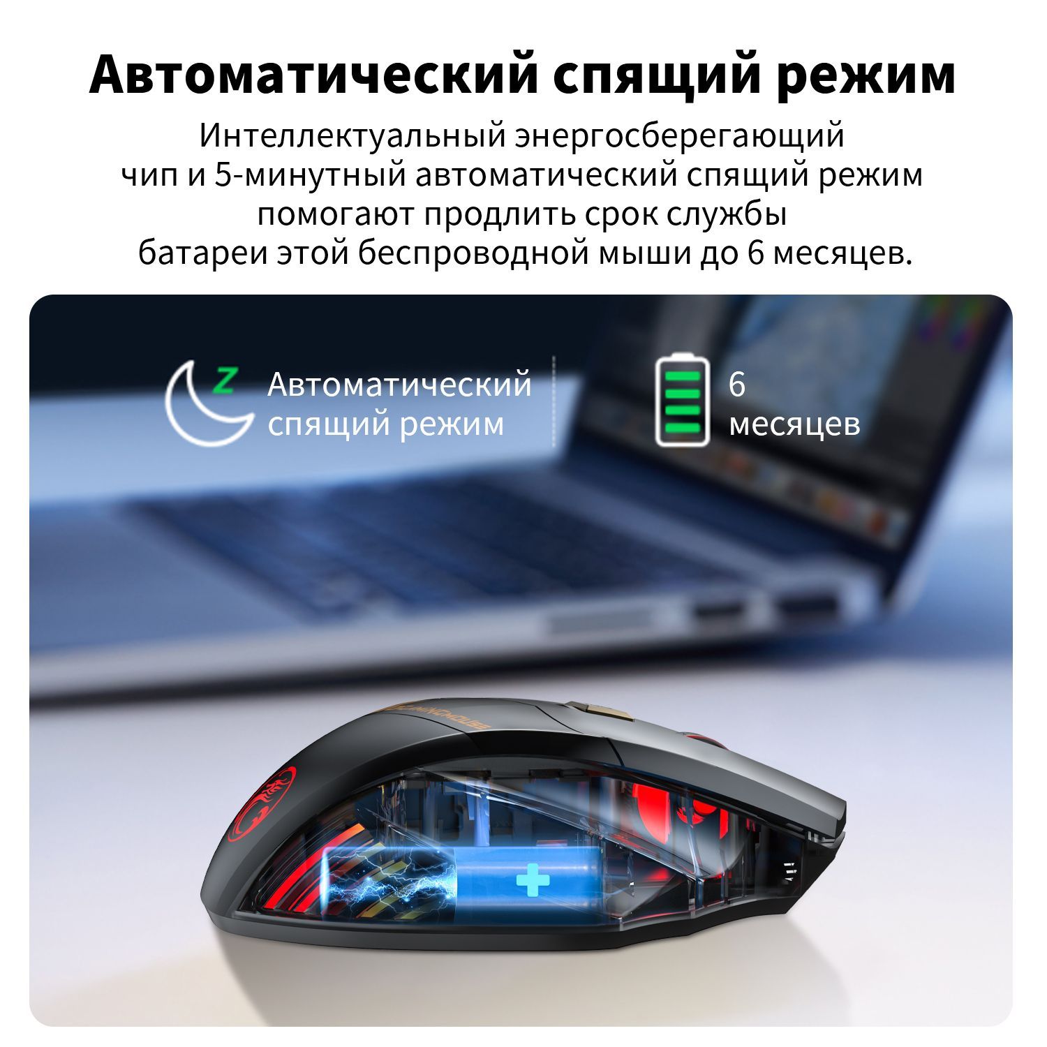 Особенности: Спящий режим, Эргономичная конструкция, Индикация заряда батареи, Колесо прокрутки