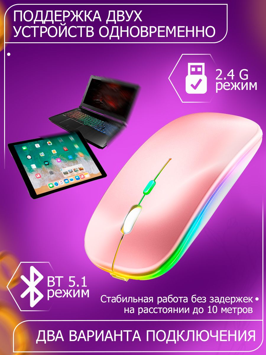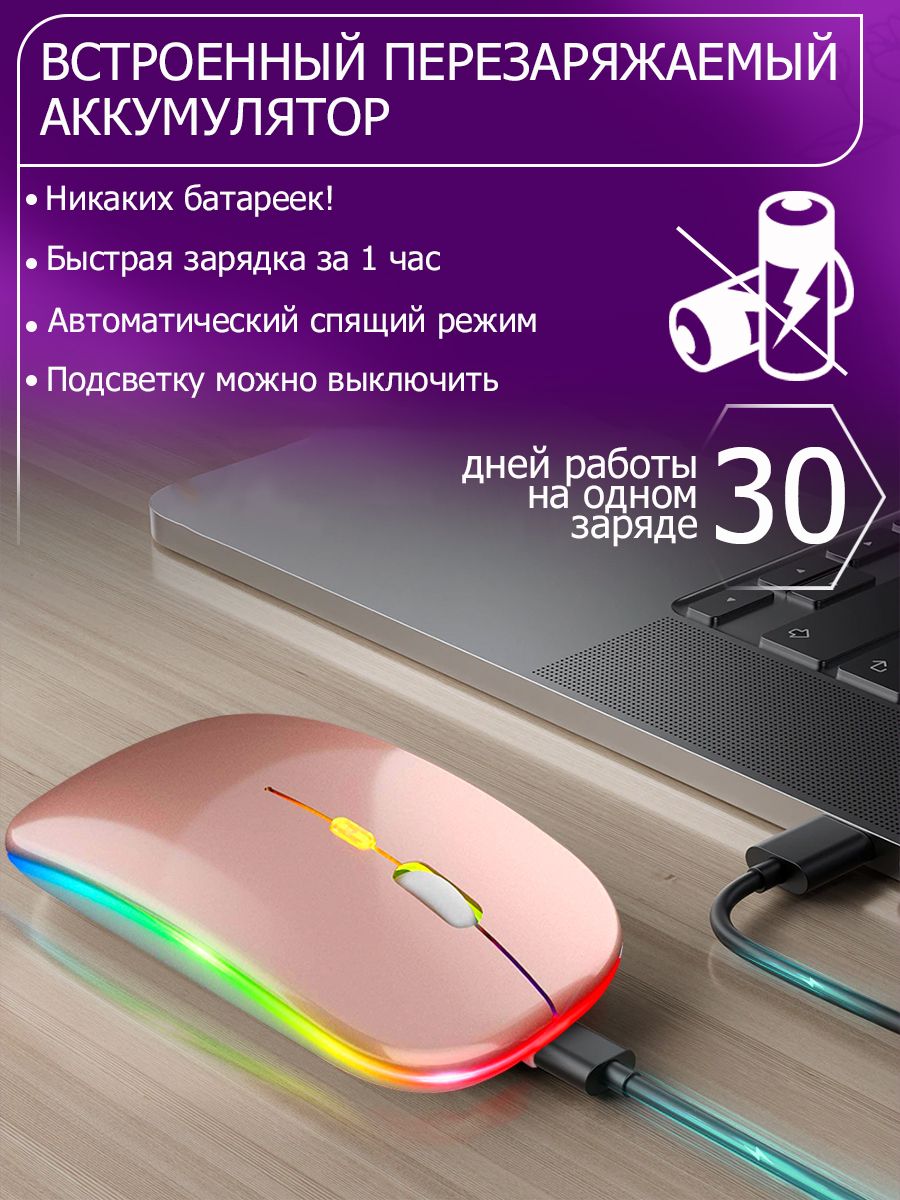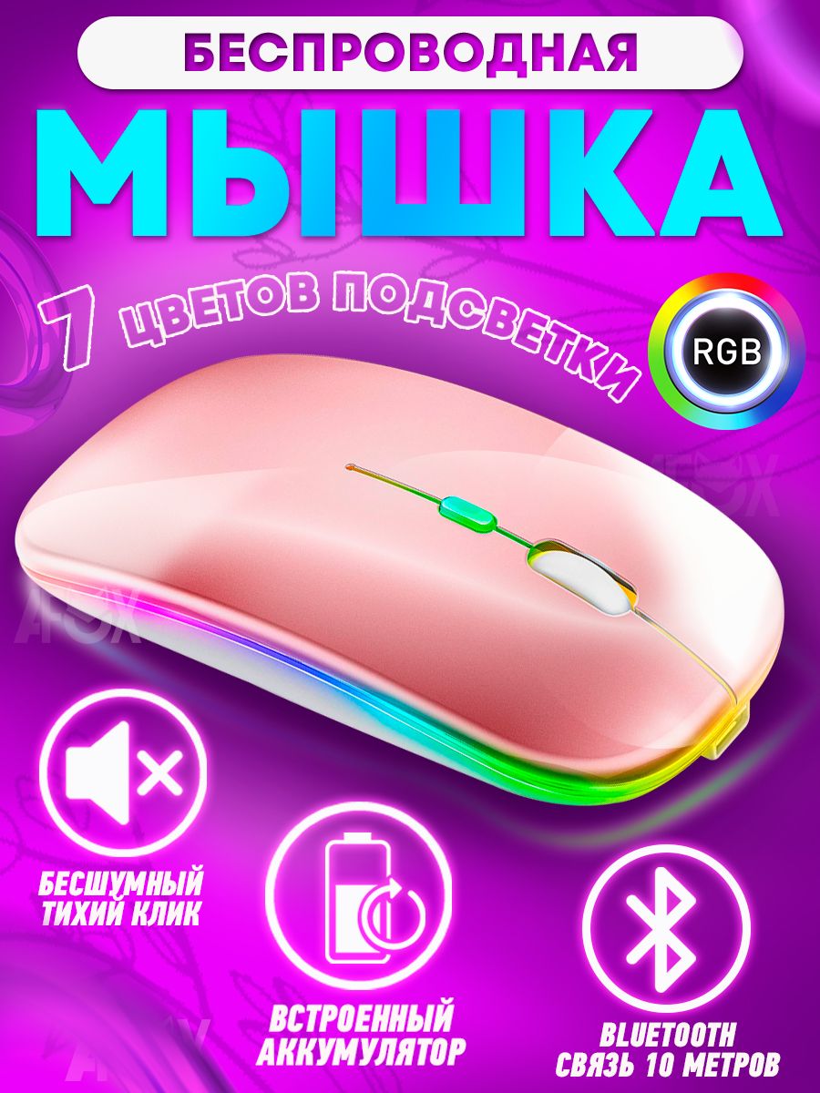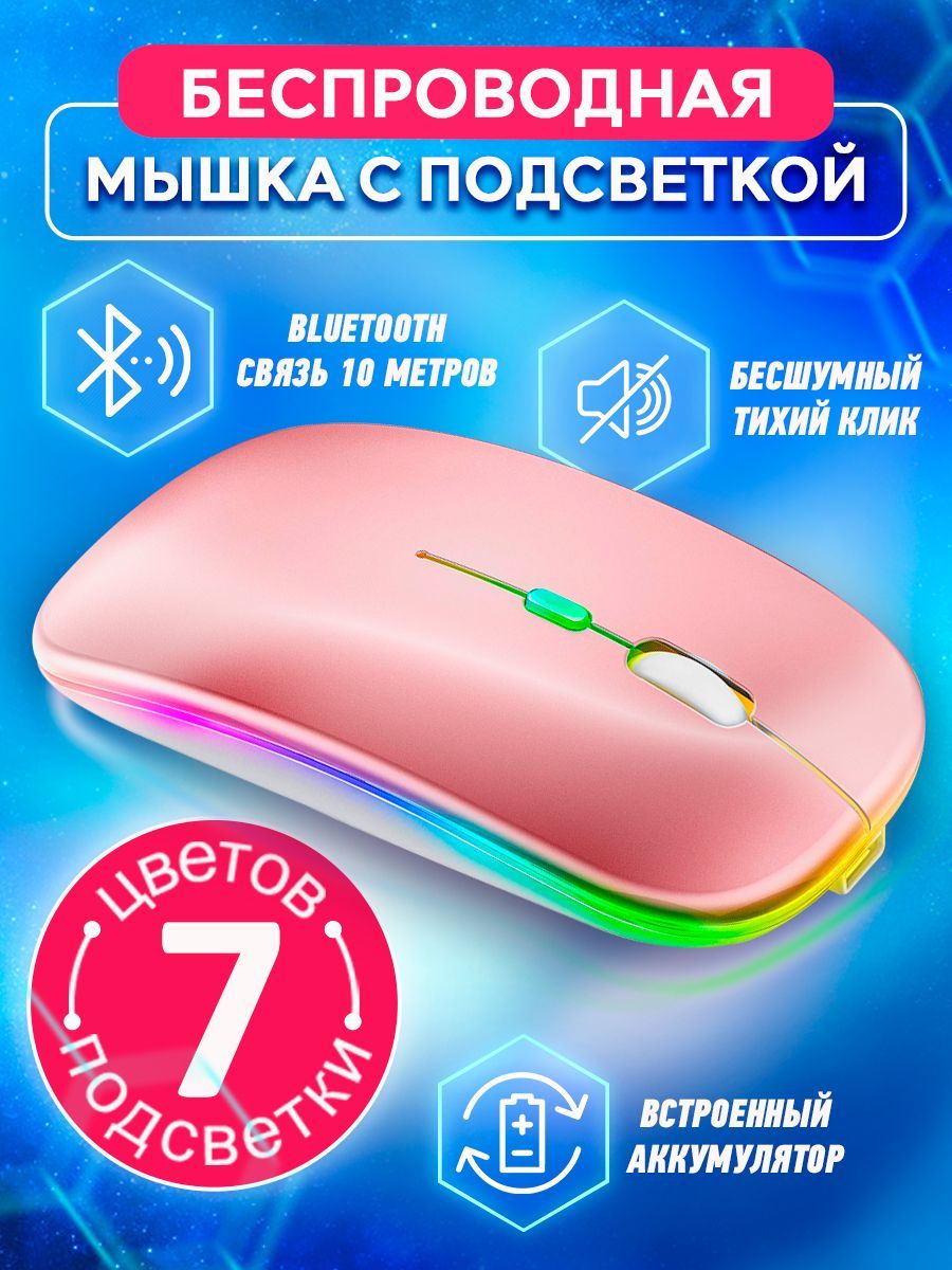 Описание: Мышка компьютерная беспроводная 1600 DPI / игровая мышь с подсветкой RGB Bluetooth бесшумная с зарядкой / цвет розовыйБеспроводная компьютерная мышь RGB с подсветкой