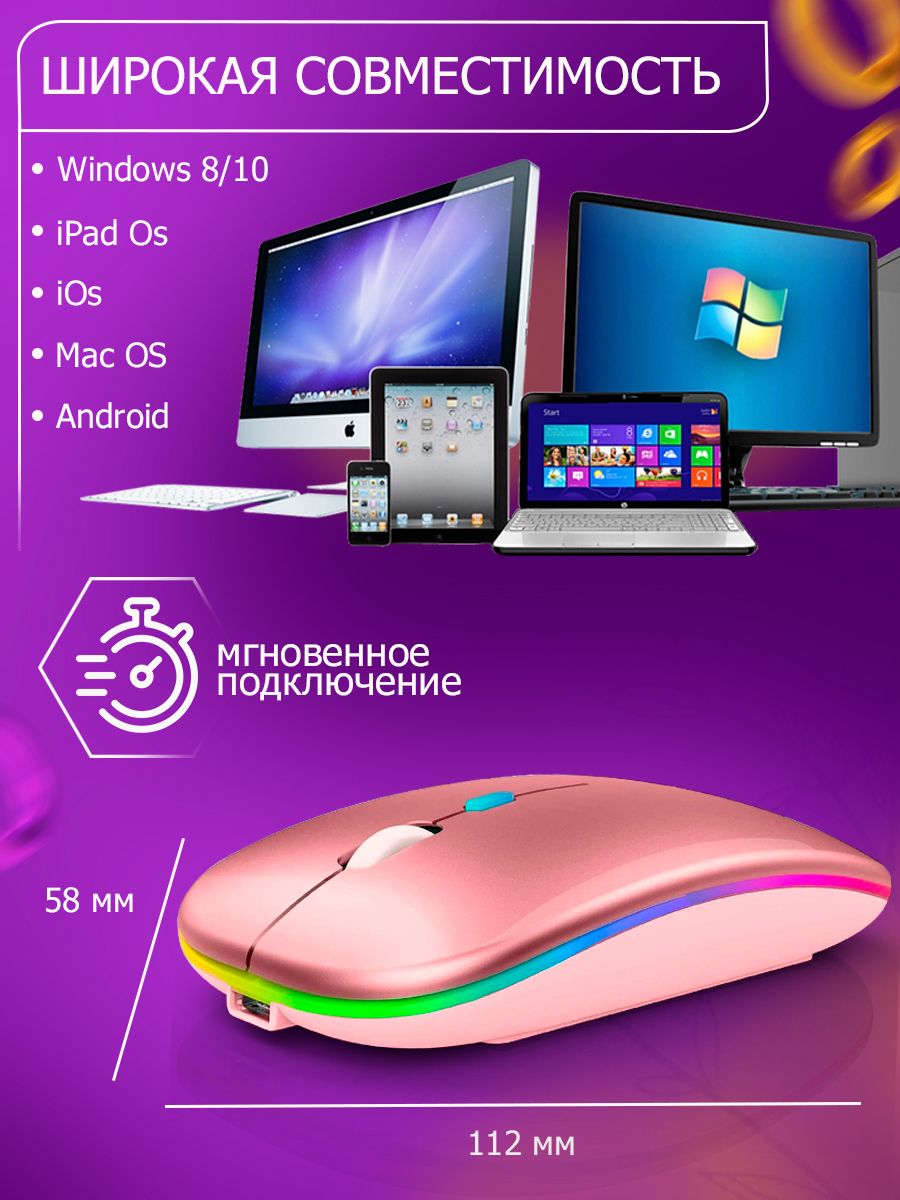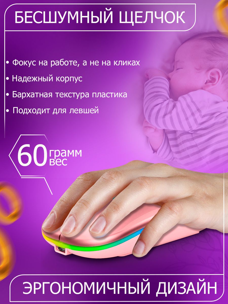 Партномер: Беспроводная компьютерная мышь RGB с подсветкой Беспроводная бесшумная компьютерная мышь с подсветкой и встроенным аккумулятором — оптимальное решение для работы, учебы и просто комфортного обращения с вашим устройством на Windows, MAC, iOS и Android. Пр