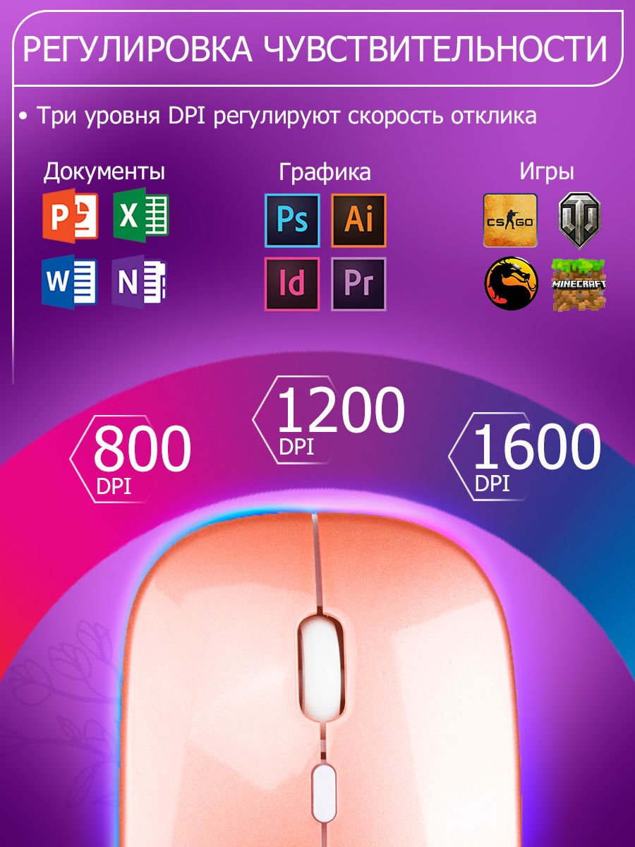Беспроводная бесшумная компьютерная мышь с подсветкой и встроенным аккумулятором — оптимальное решение для работы, учебы и просто комфортного обращения с вашим устройством на Windows, MAC, iOS и Android. Предельное разрешение сенсора составляет 1600 DPI и работает по протоколу Bluetooth 5.1 или WiFi 2,4G — а это значит отсутствие помех, высокую отзывчивость и дальность до компьютера / ноутбука/телевизора до 10 метров, а так же возможность подключаться к устройствам где нет USB разъемов. Она абсолютно бесшумна - а это избавит вас от раздражающих щелчков и даст возможность работать в полной тишине. Так же отметим высокую автономность устройства — при полный зарядке за 2-3 часа мышка способна проработать до 20 дней или находиться в режиме ожидания до одного месяца благодаря умному режиму сна в который мышка входит самостоятельно при бездействии. Зарядка от любого устройства — ноутбука, компьютера, пауэр-банка займет всего 2 часа. Её эргономичная форма и материал из софт-тач пластика оставит только положительные эмоции от управления.