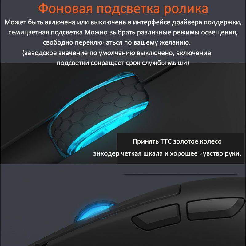 • Световой эффект прокруткиНажмите одновременно центральную кнопку + вперед (режимы настройки: постоянный свет, дыхание, смешение цветов, выкл.) ;Нажмите одновременно центральную кнопку + назад (для настройки постоянного света, цвета в режиме дыхания).