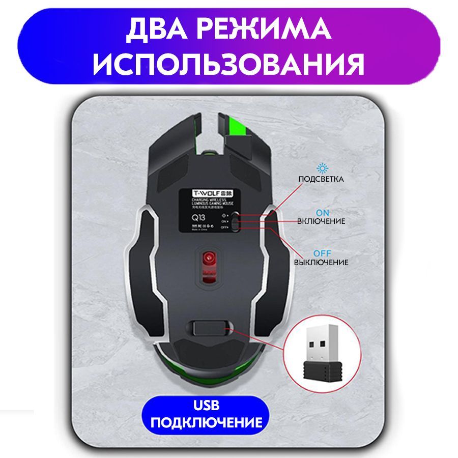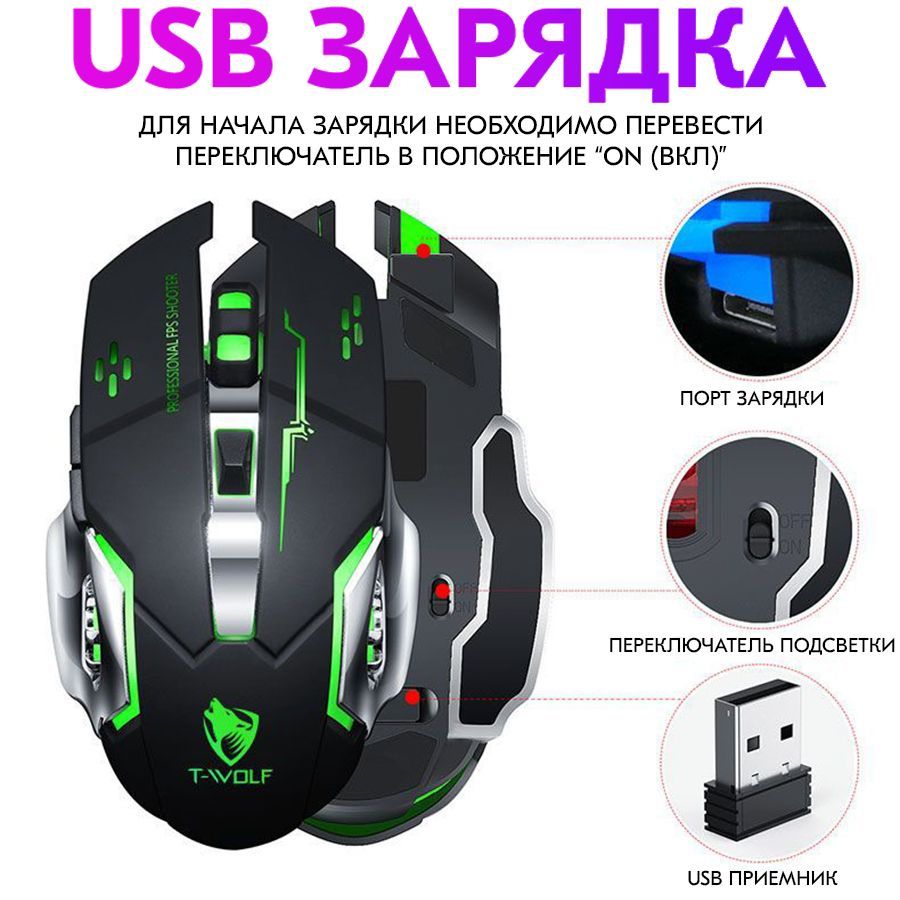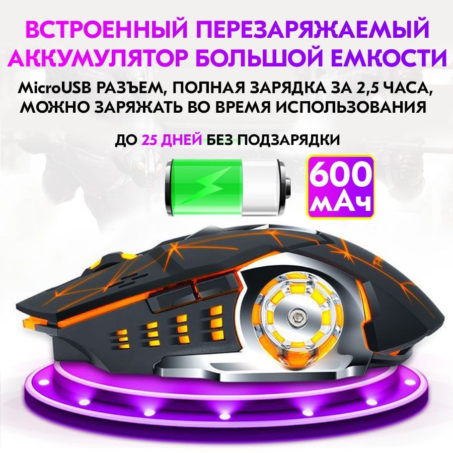 Описание: Беспроводная светящаяся игровая мышка, для которой не нужны батарейки. Перезаряжаемая беспроводная мышь имеет внутренний встроенный аккумулятор.
