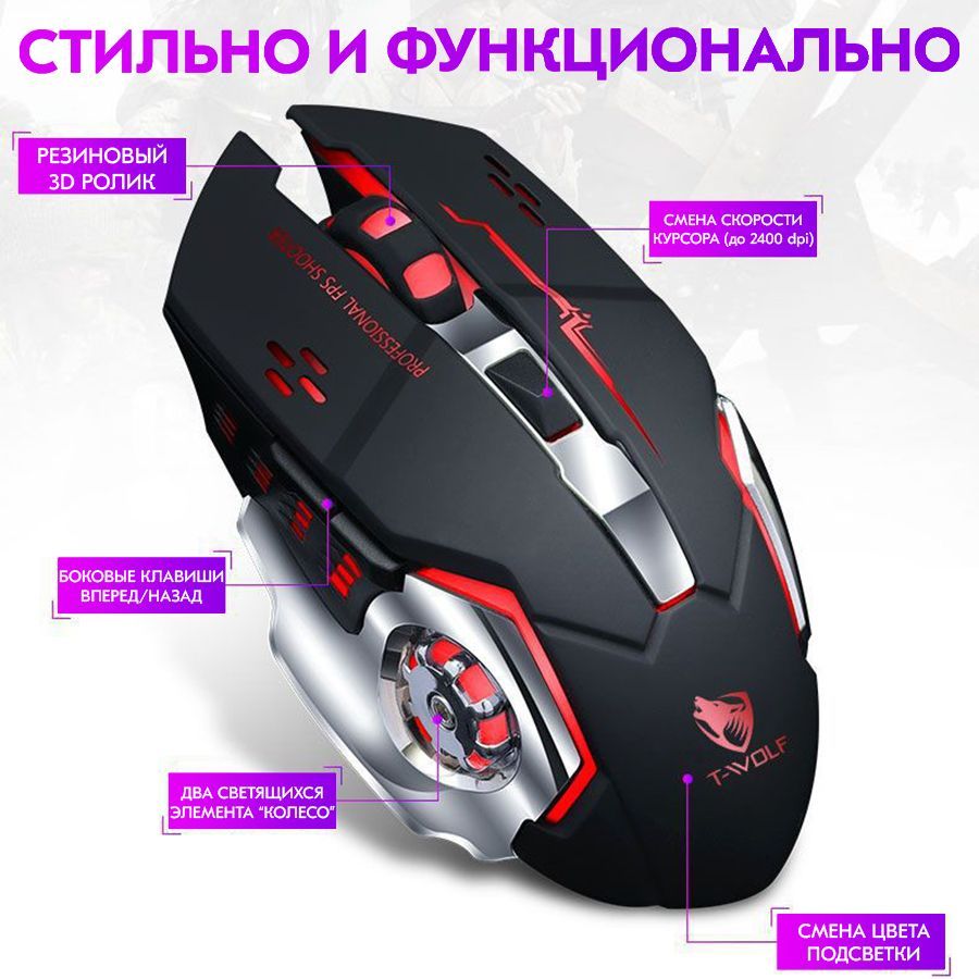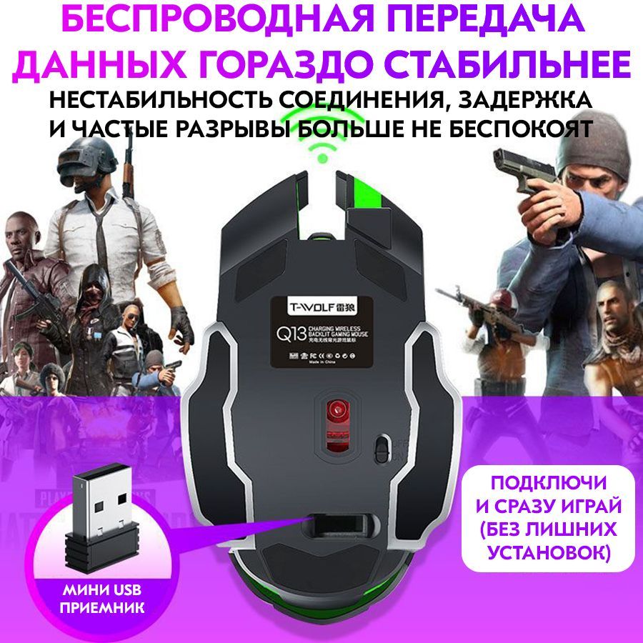 Множество привлекательных функций были интегрированы в эту беспроводную игровую мышь, такие как аккумулятор большой емкости, зарядка через USB, беспроводная передача 2,4G, подключи и работай, высокоскоростное соединение, эргономичный дизайн и т. д.