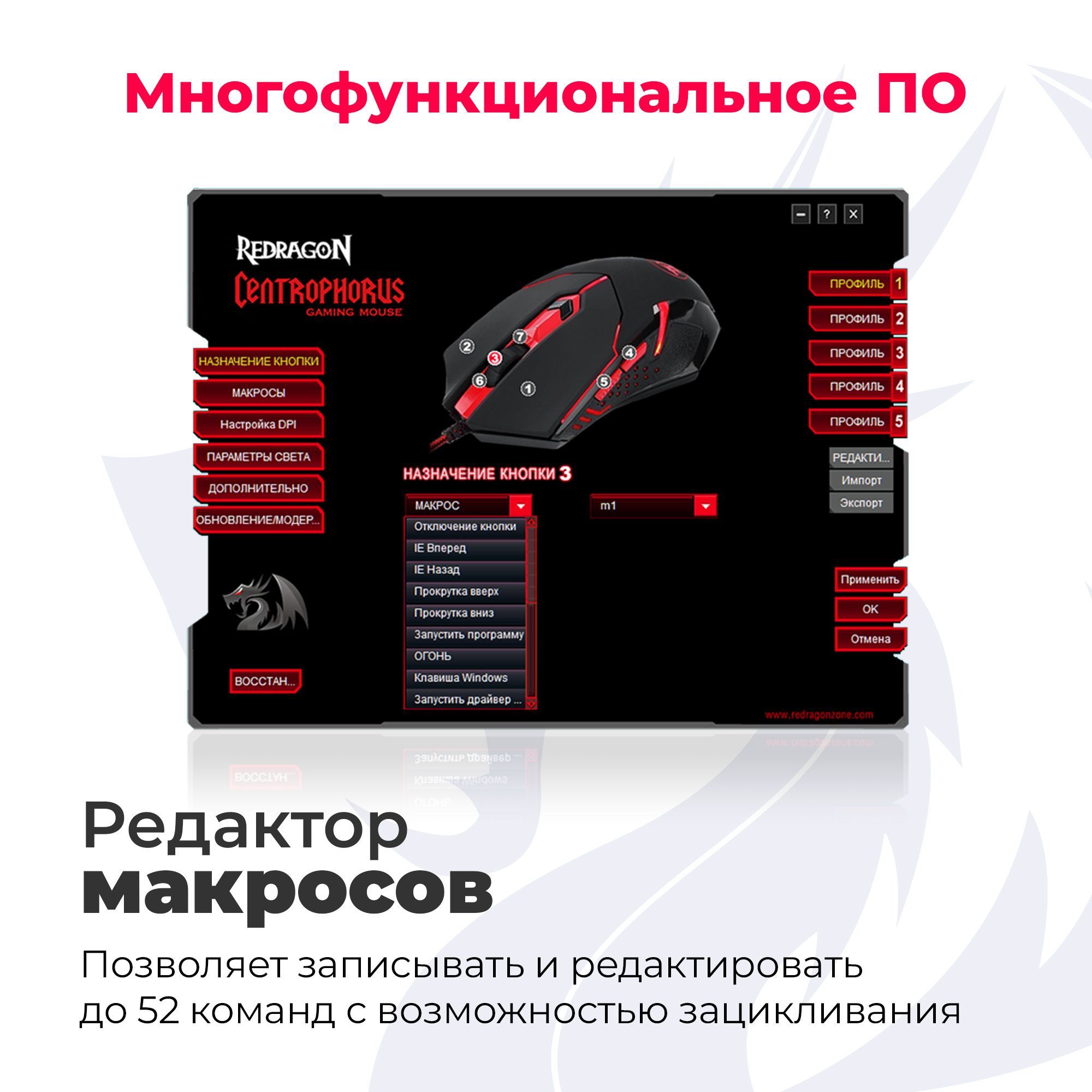 • Редактор макросов - встроенный редактор макросов позволяет записывать и редактировать последовательности до 52 команд с возможностью зацикливания;