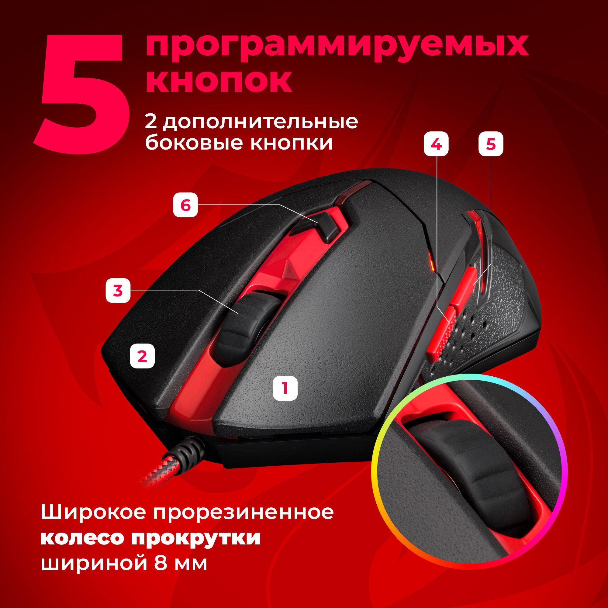• Широкое прорезиненное колесо прокрутки шириной 8 мм с подсветкой;