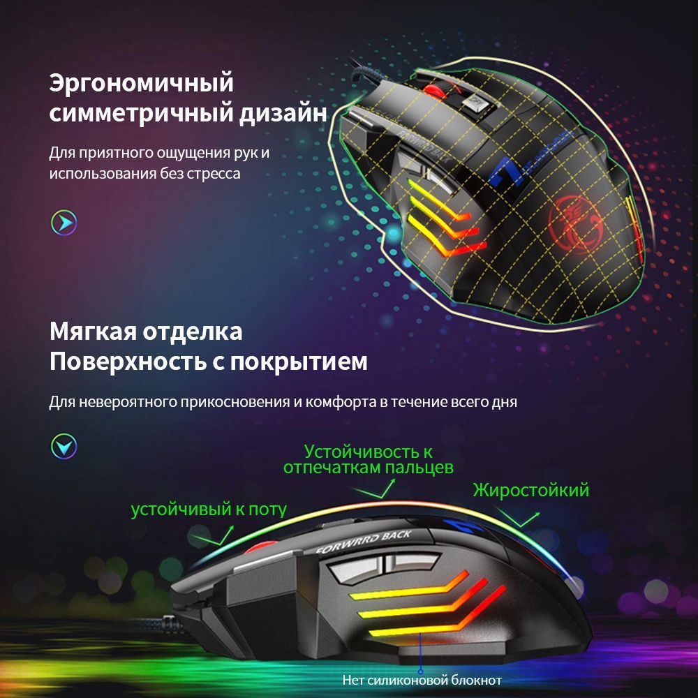 • 【7-цветная RGB-подсветка】: игровая мышь имеет 7-цветную RGB-подсветку, 7 различных цветов подсветки меняются случайным образом во время использования, что выглядит очень круто и забавно.