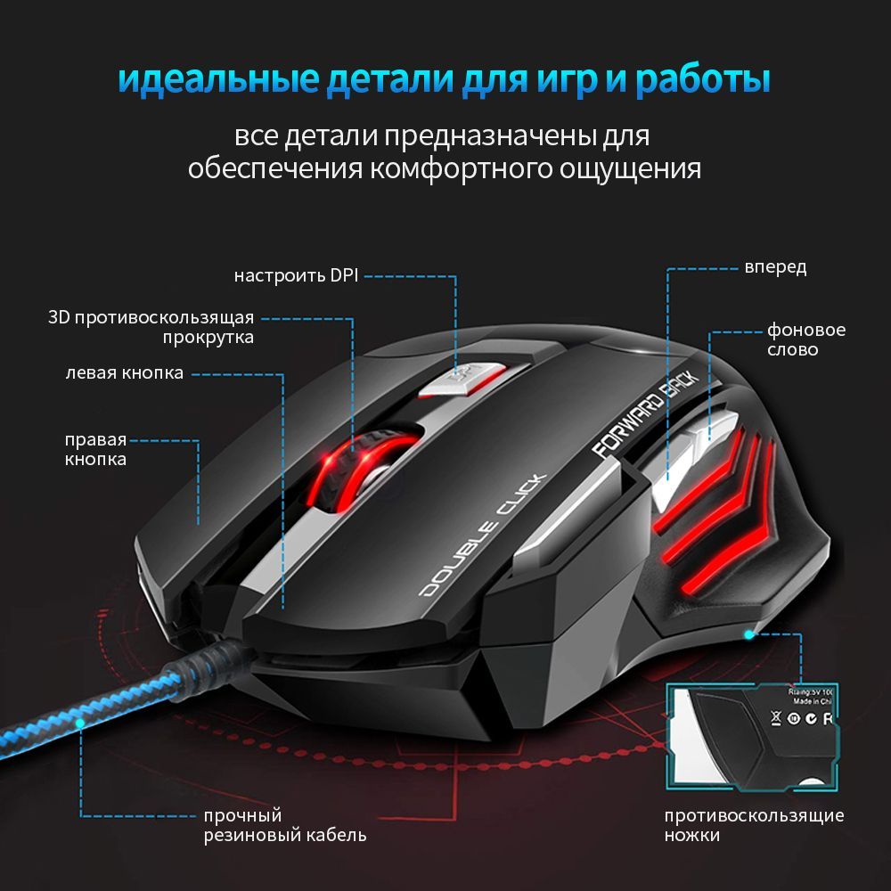 Игровая мышь проводная IMICE компьютерная игровая проводная мышь 5500 DPI игровые мышка бесшумная подсветкой для ноутбука, черный