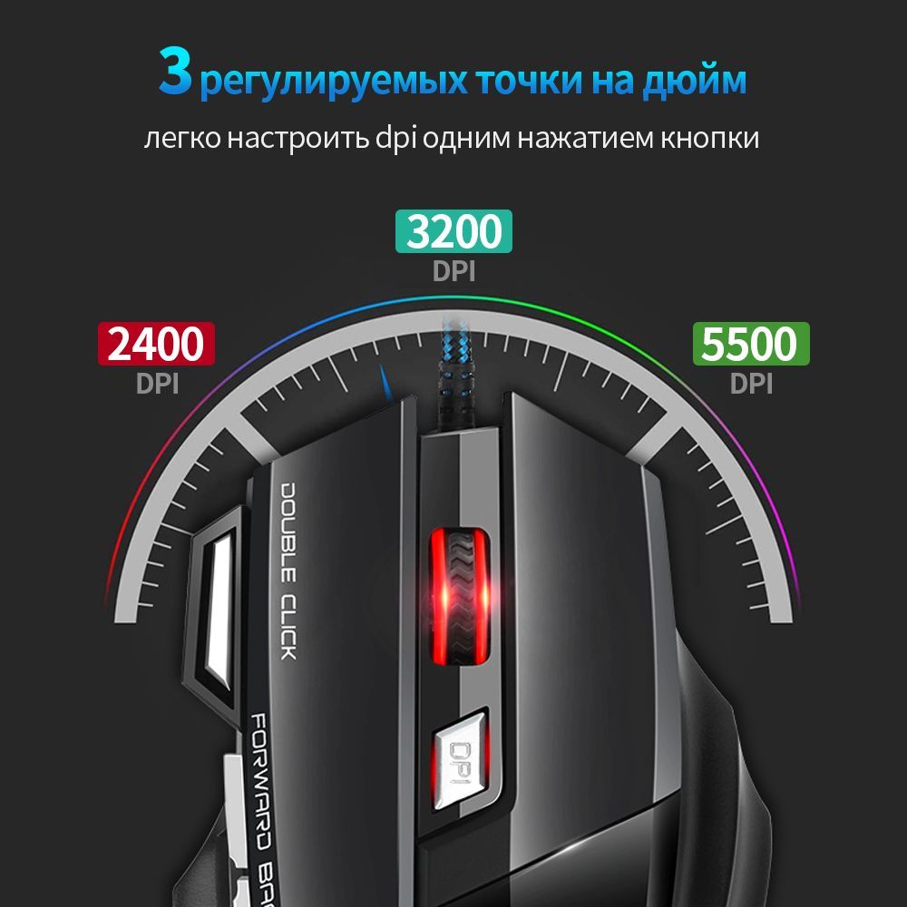 • Проводная игровая мышьСоздан для игровые компьютеры-Эргономичный X7 RGB подсветкой, игровая компьютерная мышь до 5500 точек/дюйм (изменяются пользователем2400-3200-5500DPI), высокоточный датчик обеспечивает точное определение цели, в то время как игровой класс микропереключатели обеспечивают долговечность, большая прочность и Экстремальная отзывчивость, давая вам еще больший край над вашей соревнованием