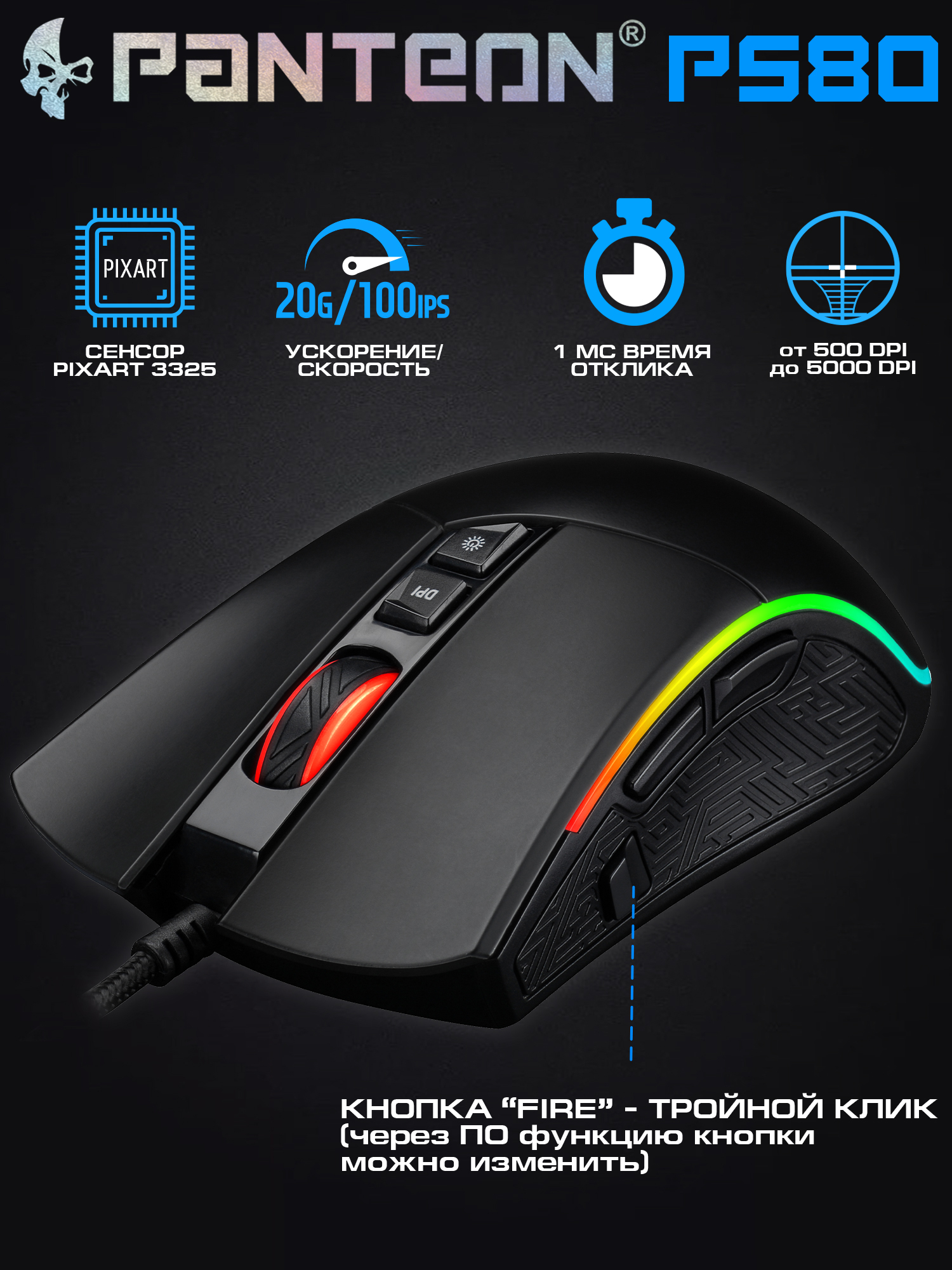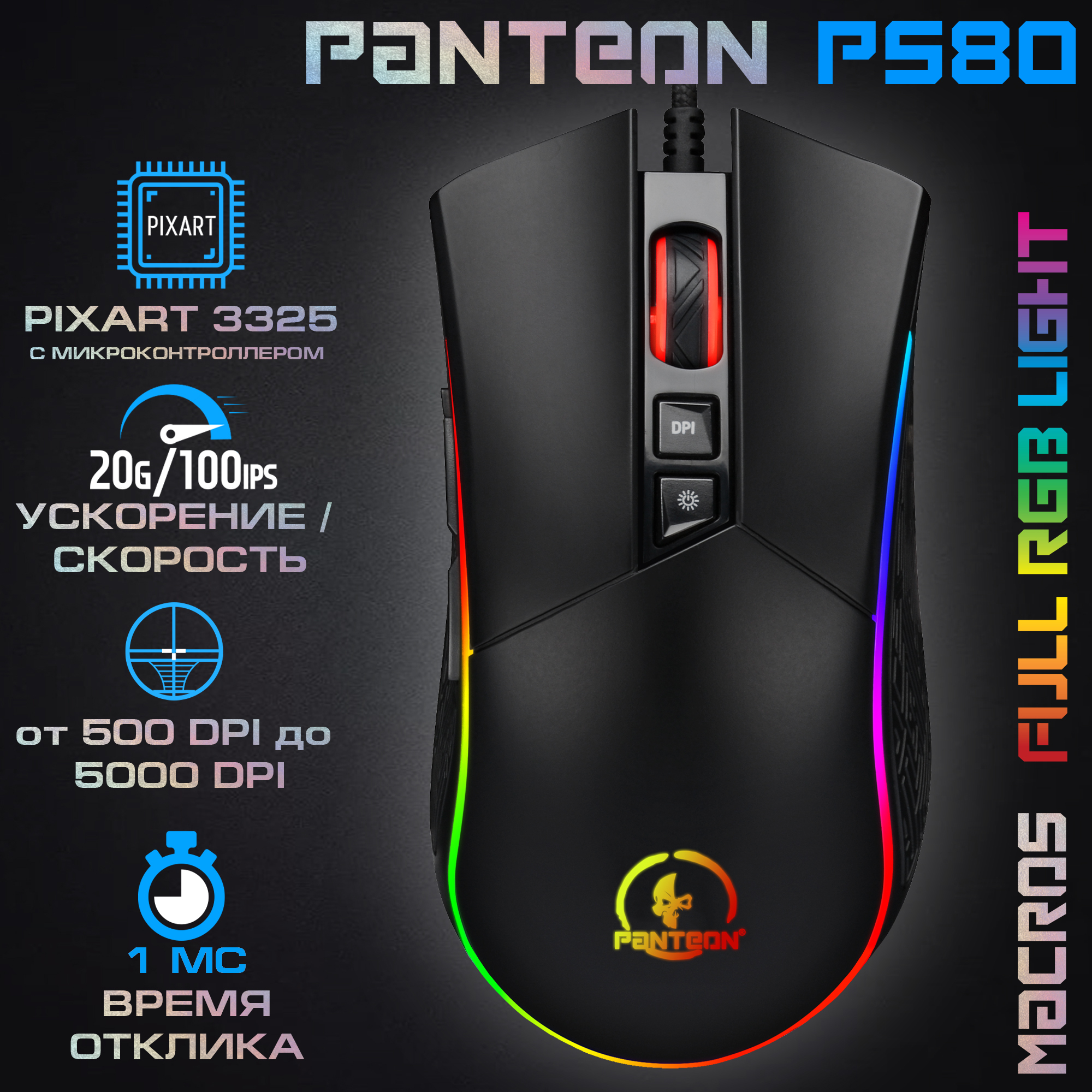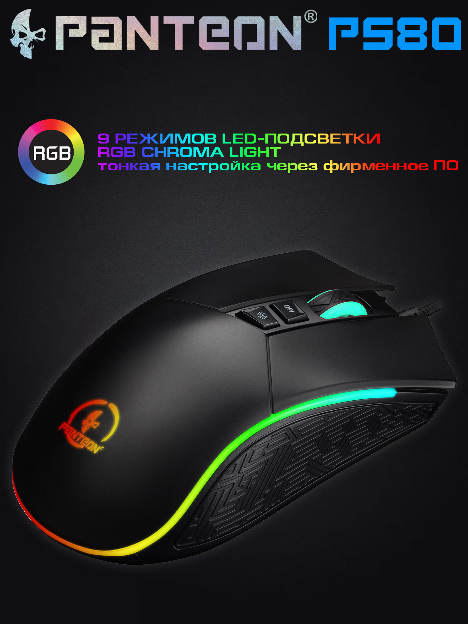Игровая мышь с LED-подсветкой RGB CHROMA LIGHT PANTEON PS80 черная (Pixart 3325 с микроконтроллером, 100 IPS/20G, 500-5000/10000 dpi, 125-1000 Гц, отклик 1мс, 8 кнопок, LED 9 режимов, кабель 1.8м,USB)