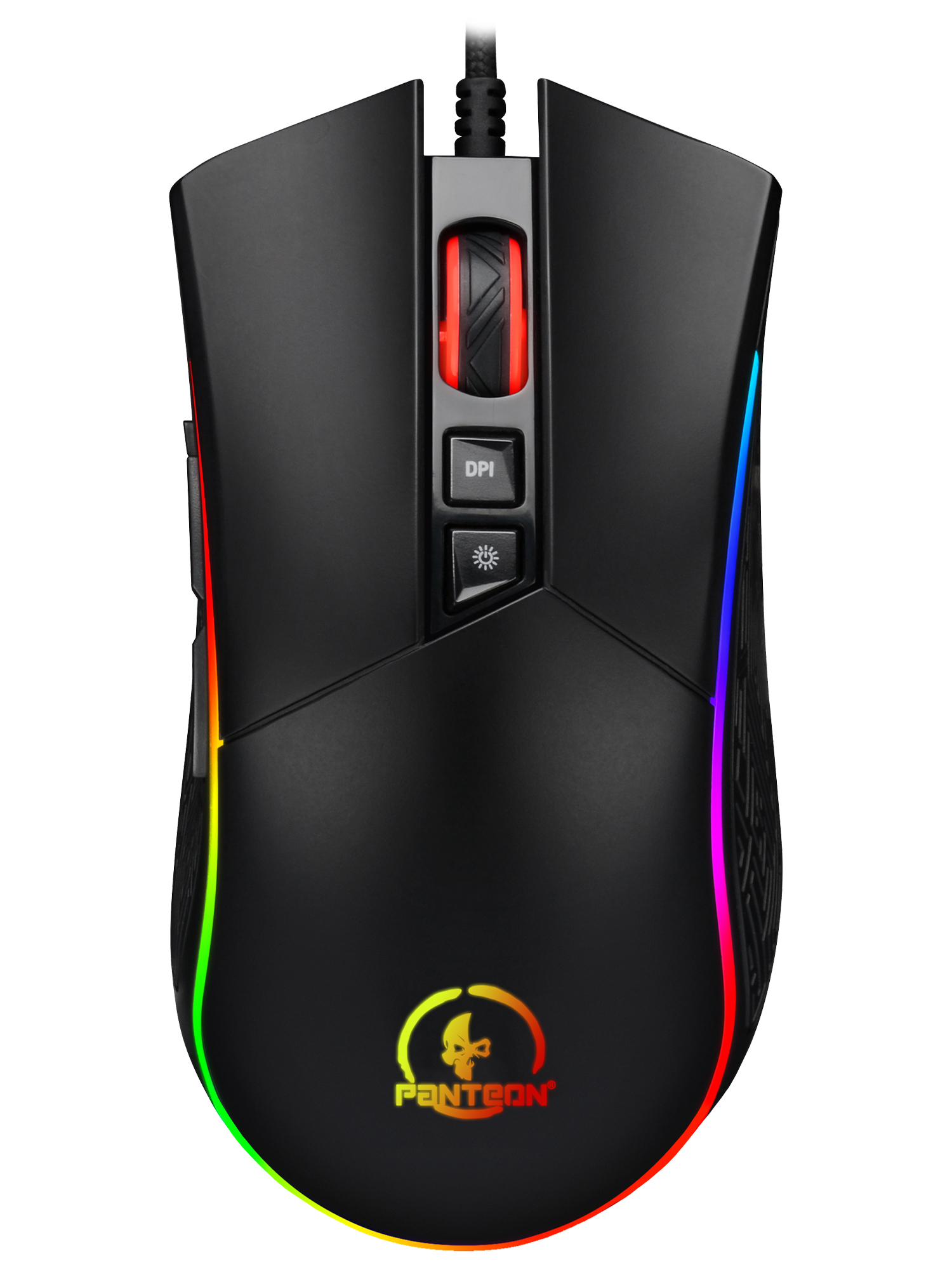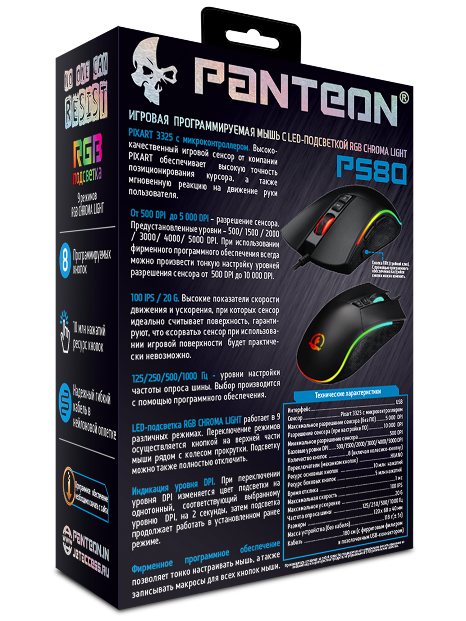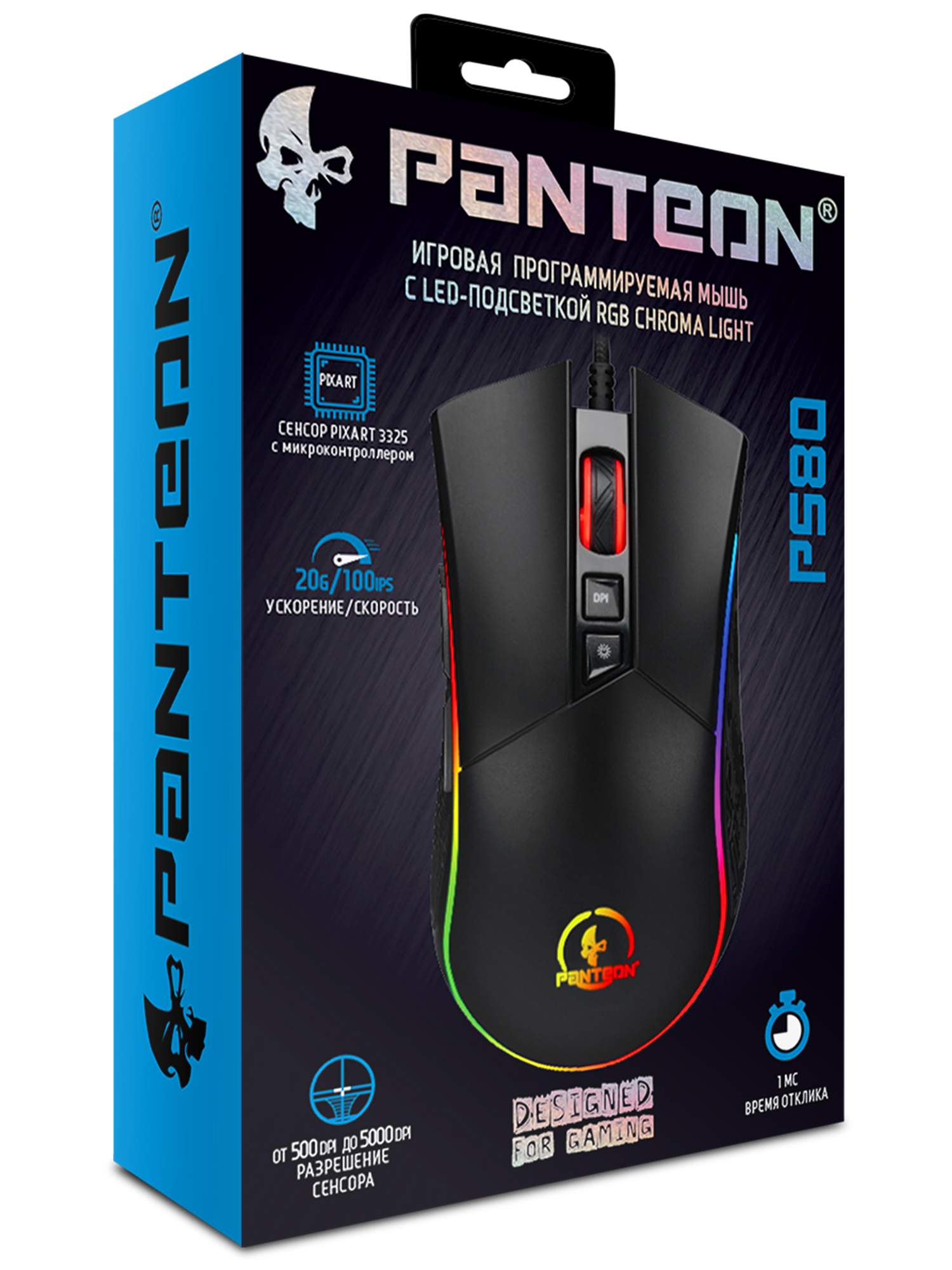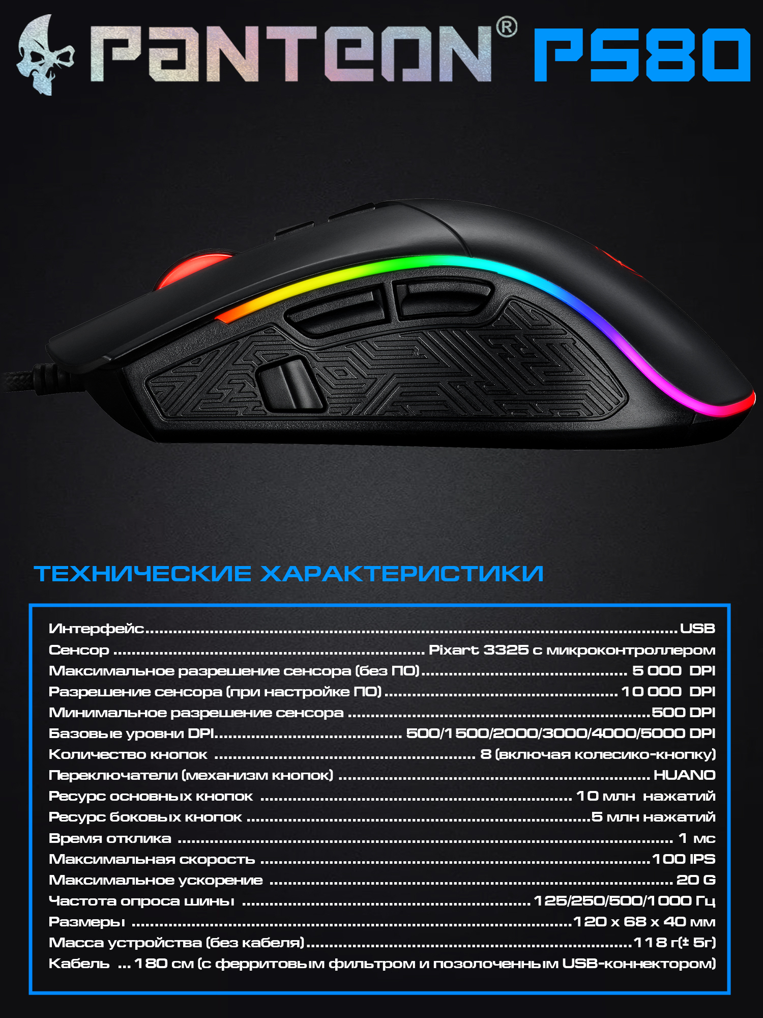 Игровая мышь с LED-подсветкой RGB CHROMA LIGHT PANTEON PS80 черная (Pixart 3325 с микроконтроллером, 100 IPS/20G, 500-5000/10000 dpi, 125-1000 Гц, отклик 1мс, 8 кнопок, LED 9 режимов, кабель 1.8м,USB)