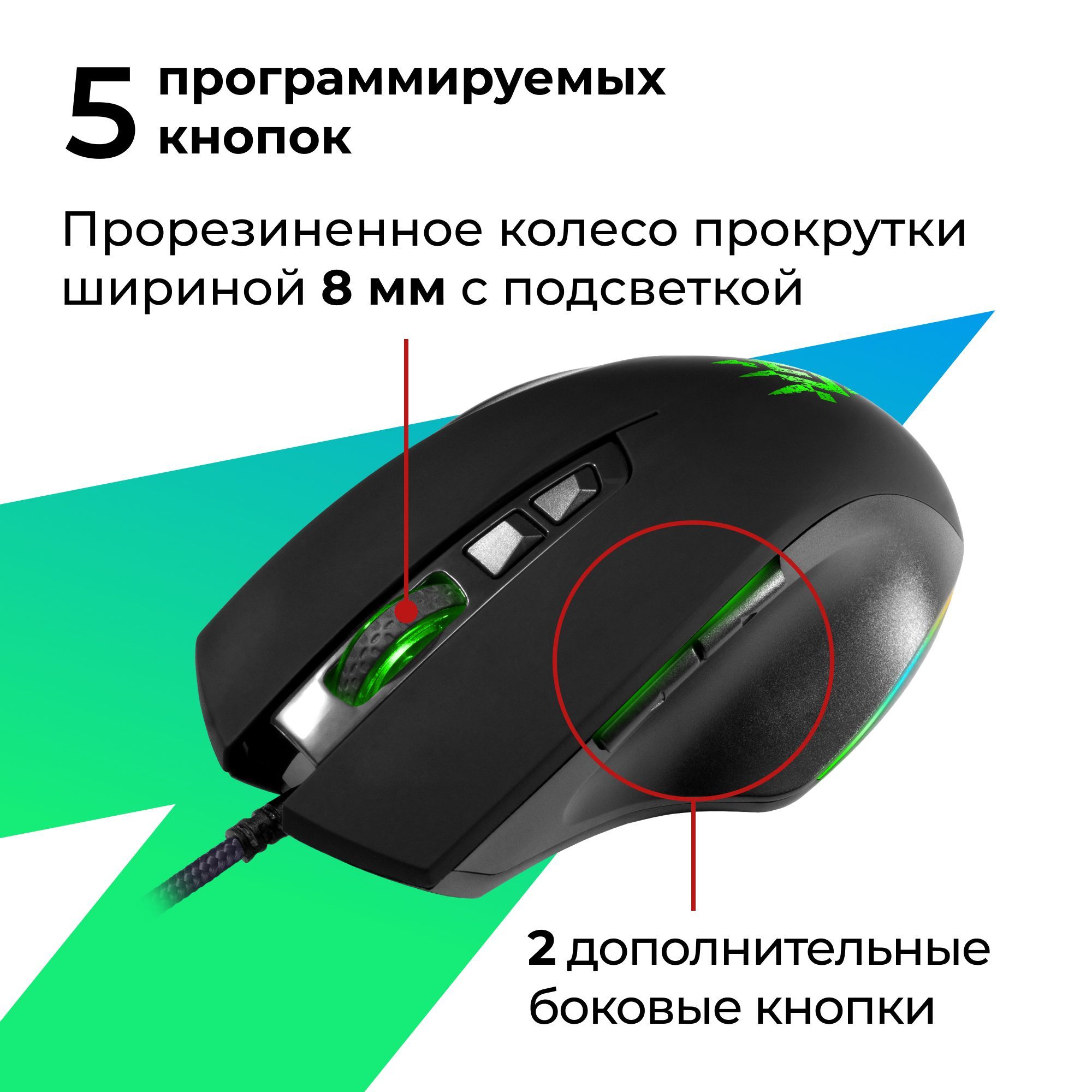 • Широкое прорезиненное колесо прокрутки шириной 8 мм с подсветкой.