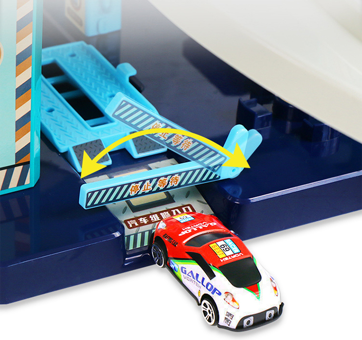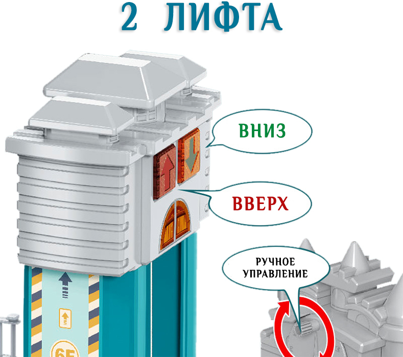Все машинки могут подниматься и спускаться на любой из 6 уровней как на обычном ручном, так и на электрическом лифте, работающим от батареек. Для подъёма автомобилей на ручном лифте имеется удобный фронтальный поворотный рычаг, стилизованный под часы. На электролифте можно управлять спуском и подъёмом с помощью светящихся кнопочек "Вверх" и "Вниз", помогающих точно позиционировать лифтовую площадку напротив выбранного уровня паркинга.