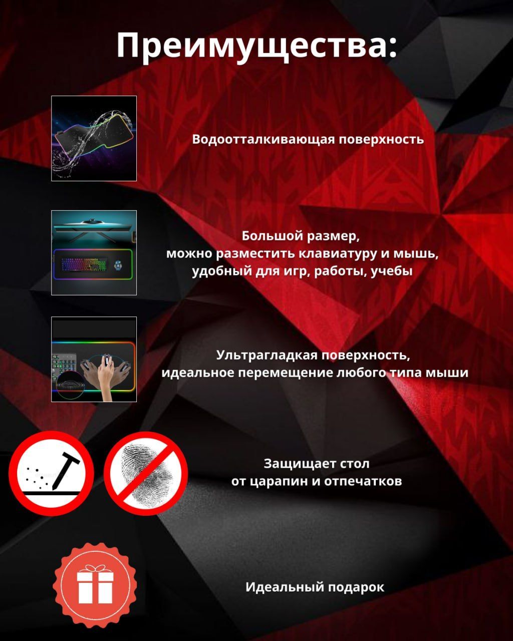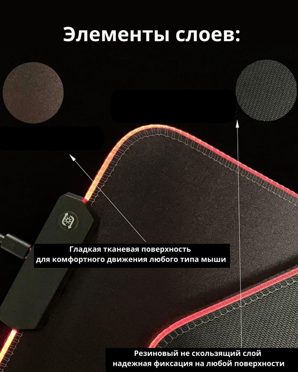 Особенности коврика: Водоотталкивающая поверхность, Нескользящая основа, Подсветка, Прошитые края