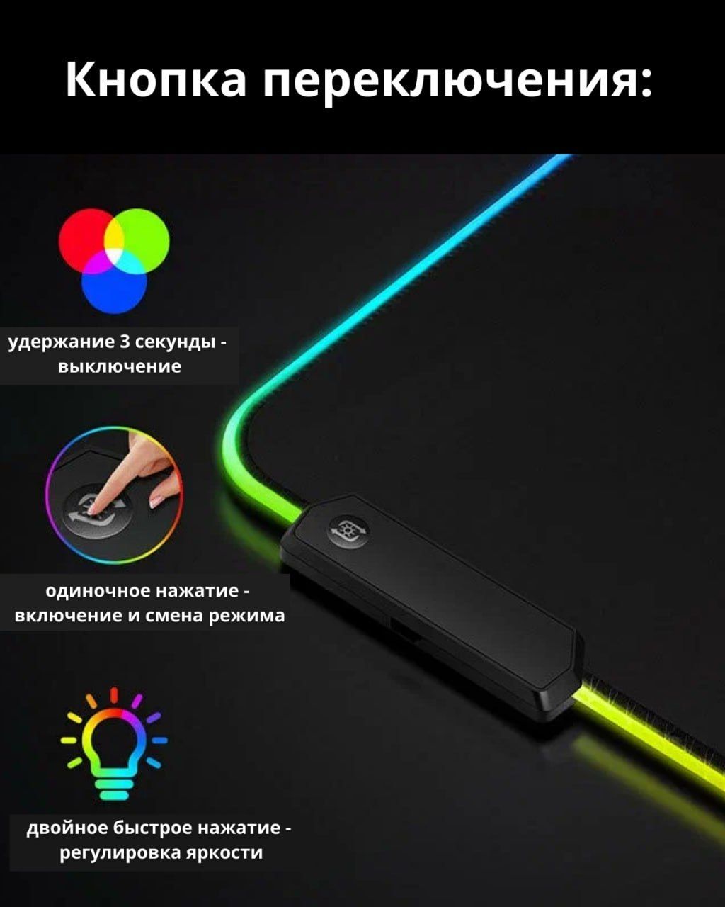 Описание: Большой игровой коврик для мыши с RGB подсветкой подходит для любого типа мыши (оптическая и лазерная) и служит отличным решением для решения организации игровой и рабочей поверхности.