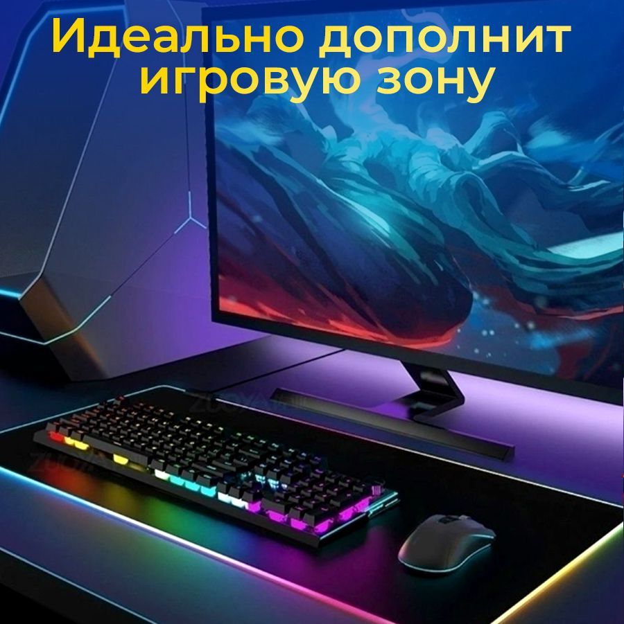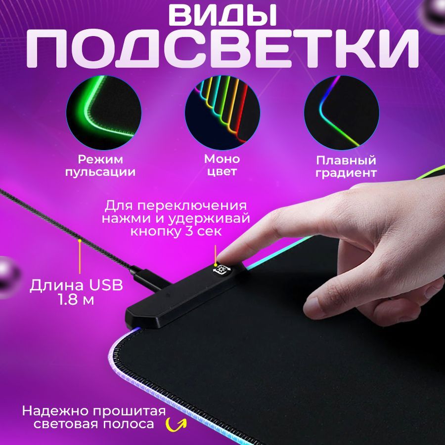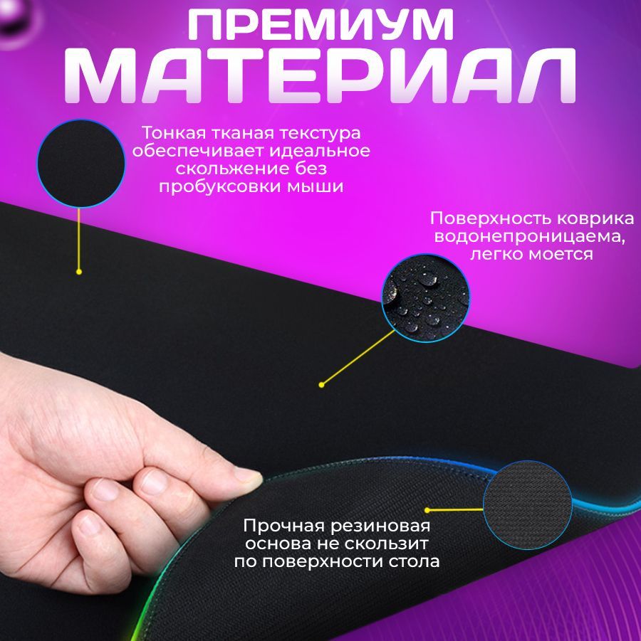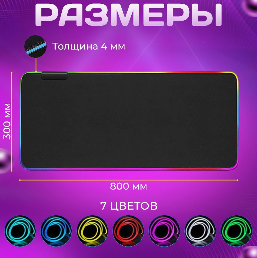 Описание: Компьютерный коврик для мышки игровой с LED подсветкой это удобное и эффектное решение для организации вашей рабочей или игровой зоны. Резиновый коврик имеет достаточно большой размер, можно удобно разместить ноутбук, макбук, планшет и беспроводную или проводную мышку, клавиатуру. Противоскользящий коврик также подойдет как подставка (защита) под компьютер, видеокарту, периферийные аксессуары и компьютерный руль. Нескользящая каучуковая основа аксессуара гарантирует, что мягкий коврик не будет "ездить" по столу. Коврик имеет неоновую RGB подсветку, световая полоса надежно прошита, что гарантирует длительный срок службы компьютерного коврика. ПВХ коврик имеет 14 режимов подсветки, и 7 разных цветов выглядят необычно. Удобная кнопка смены цвета и переключения режимов подсветки находится в верхней части аксессуара для пк. USB - кабель в комплекте подходит к любому устройству: ноутбуку, компьютеру или powerbank. Эргономичный яркий дизайн привлекает внимание, а водоотталкивающее покрытие гарантирует износостойкость коврика. Компьютерный коврик для мыши с подсветкой украсит любой интерьер, станет незаменимым подарком для друга геймера, подростка, школьника, сына.