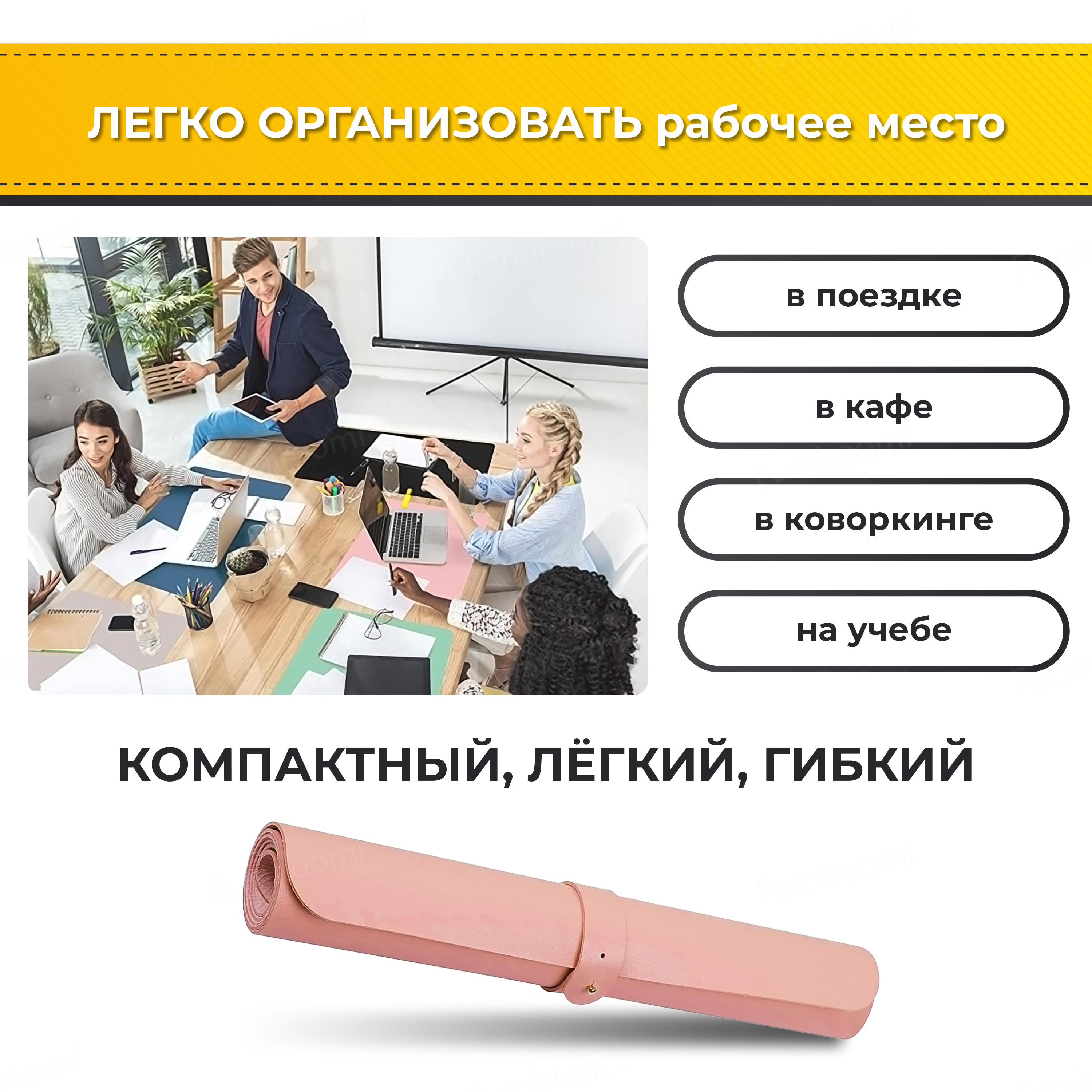 Можно легко свернуть и взять с собой в институт, офис, коворкинг, поработать в кафе. Компьютерный коврик не скользит по столу благодаря основе из искусственной замши. Рука не устает при работе, так как нет перепада высот.